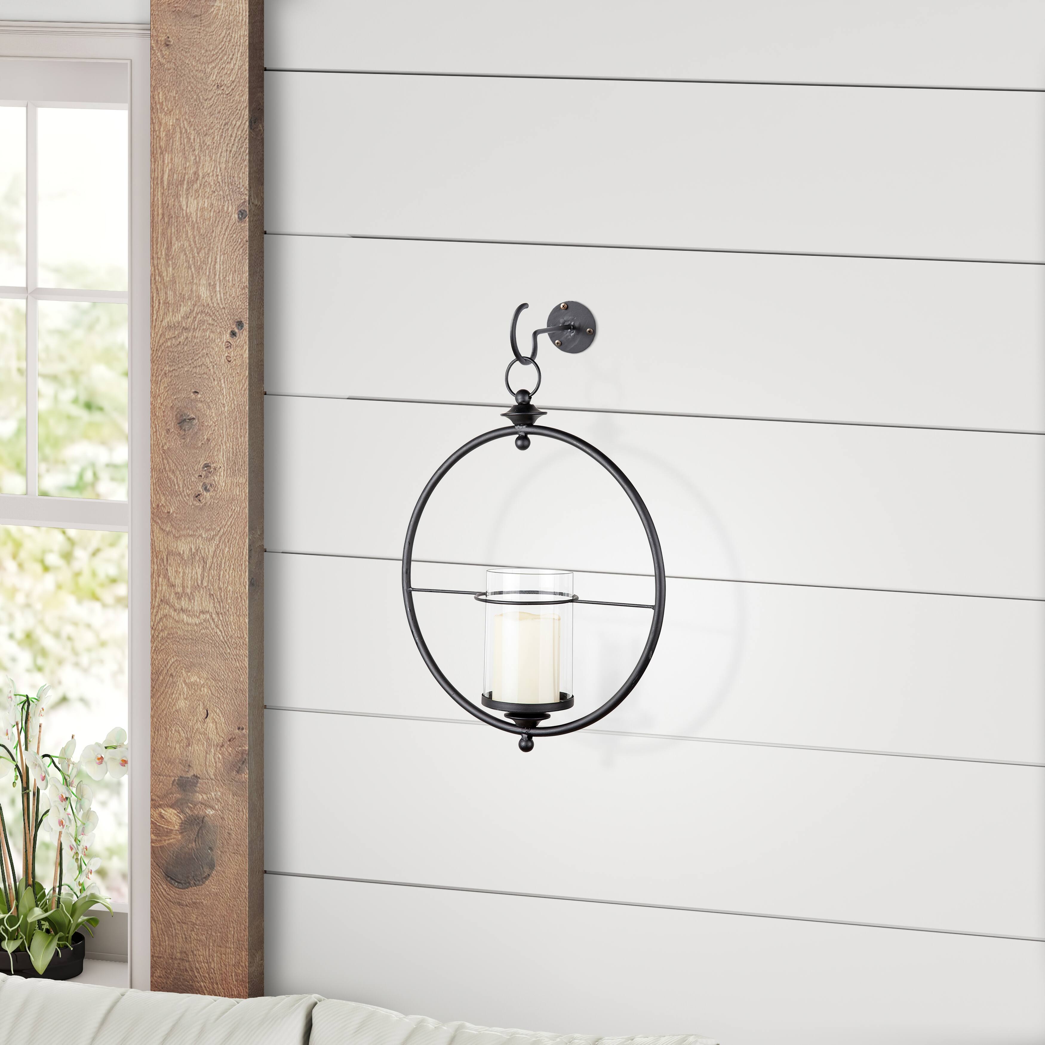 Round Wrought Iron & Glass Hanging Hurricane Sconce for Wall / Ceiling