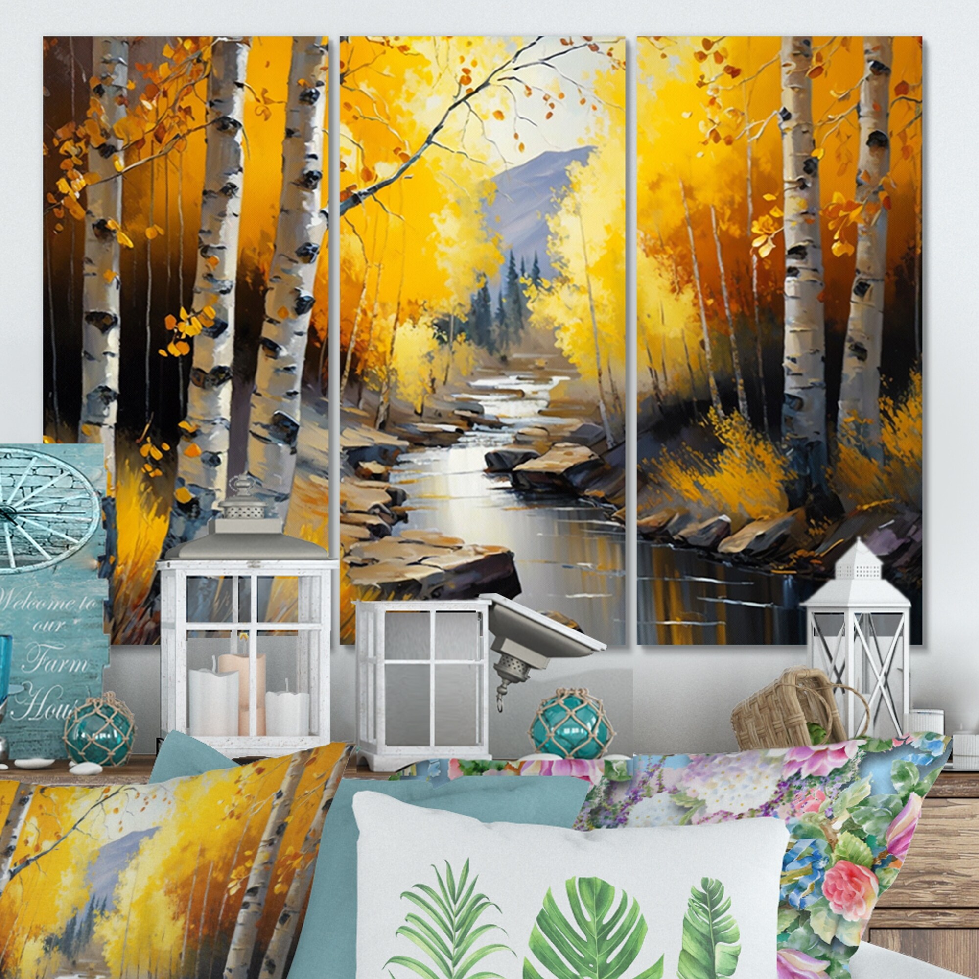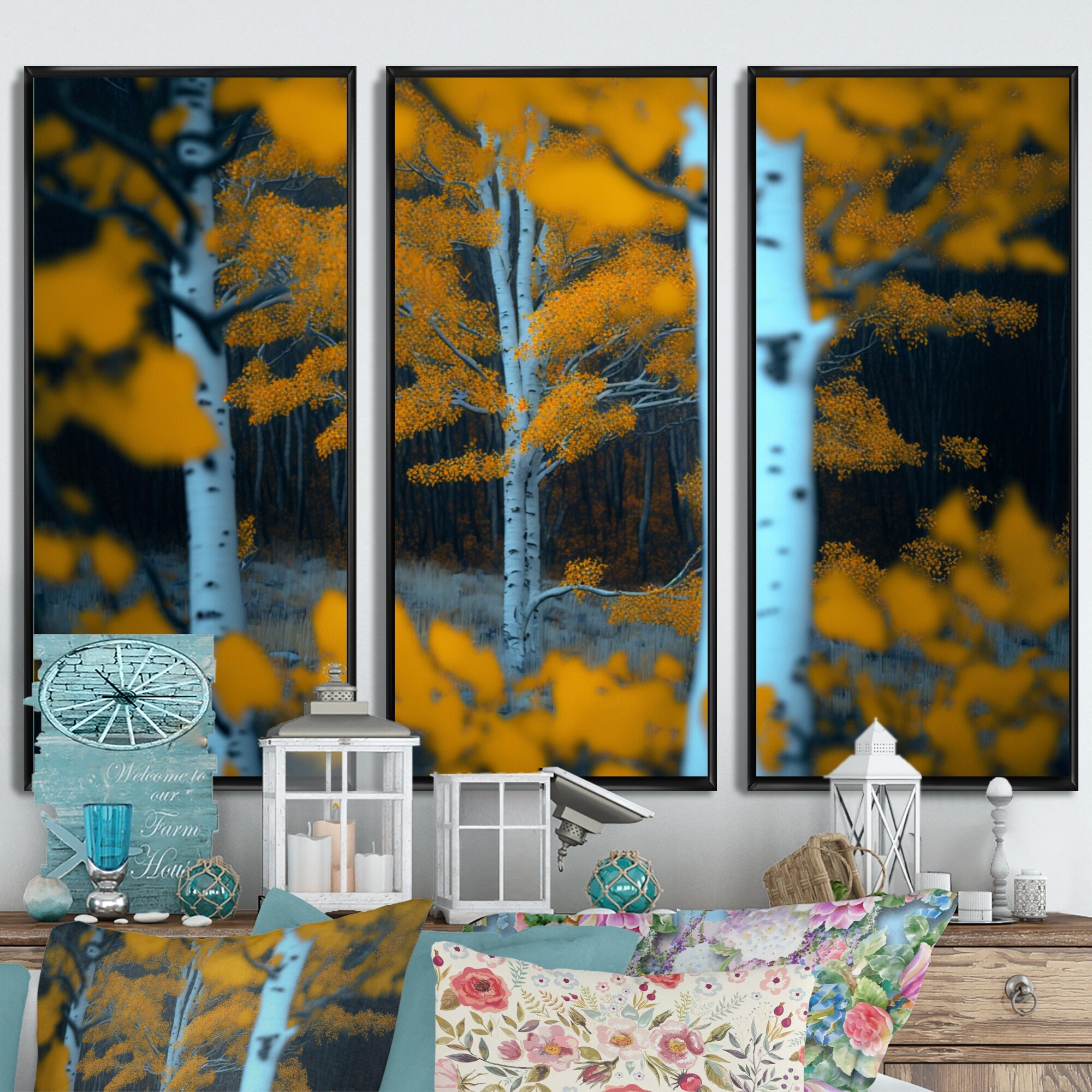Designart "Close-up Of Yellow Leaf Birches in the Forest II" Landscape Forest Framed Canvas Wall Art Print - 3 Panels