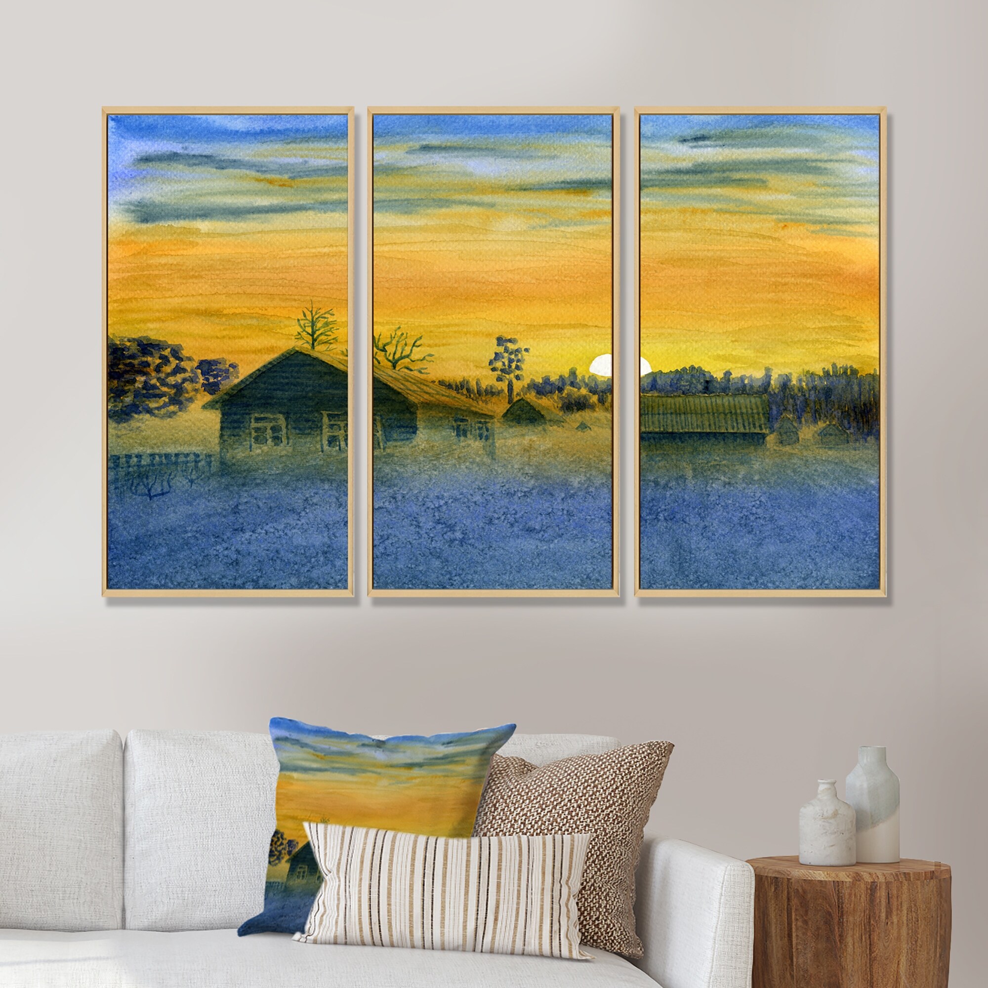 Designart "Frosty Yellow Winter Morning in the Village" Country Framed Canvas Wall Art Print Set of 3 - 4 Colors of Frames