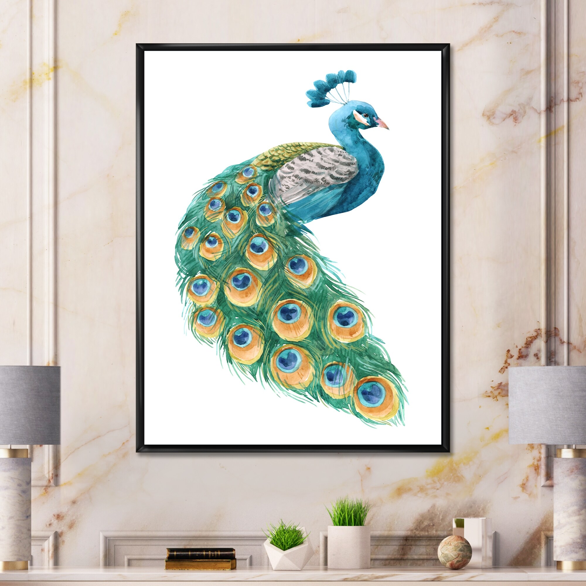 Designart "Vibrant Blue Yellow And Green Peacock" Traditional Framed Canvas Wall Art Print