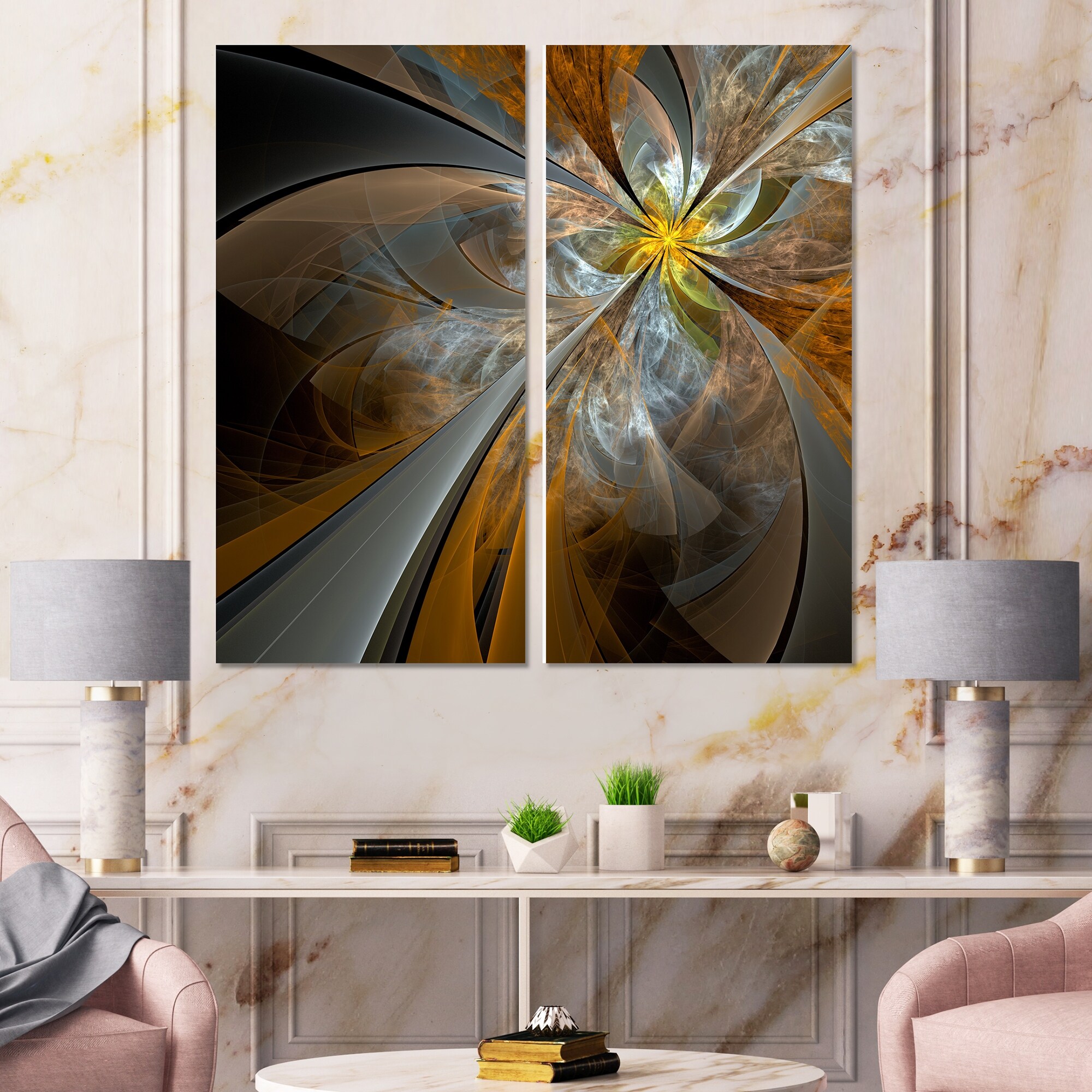 Designart "Symmetrical Yellow Fractal Flower" Abstract Canvas Wall Art Print 2 Piece Set