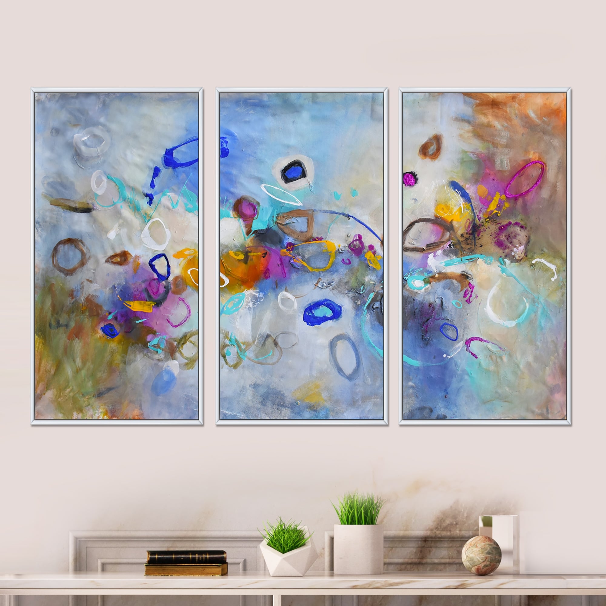 Designart "Blue And Yellow Color Spatters III" Contemporary Framed Art Set of 3 - 4 Colors of Frames