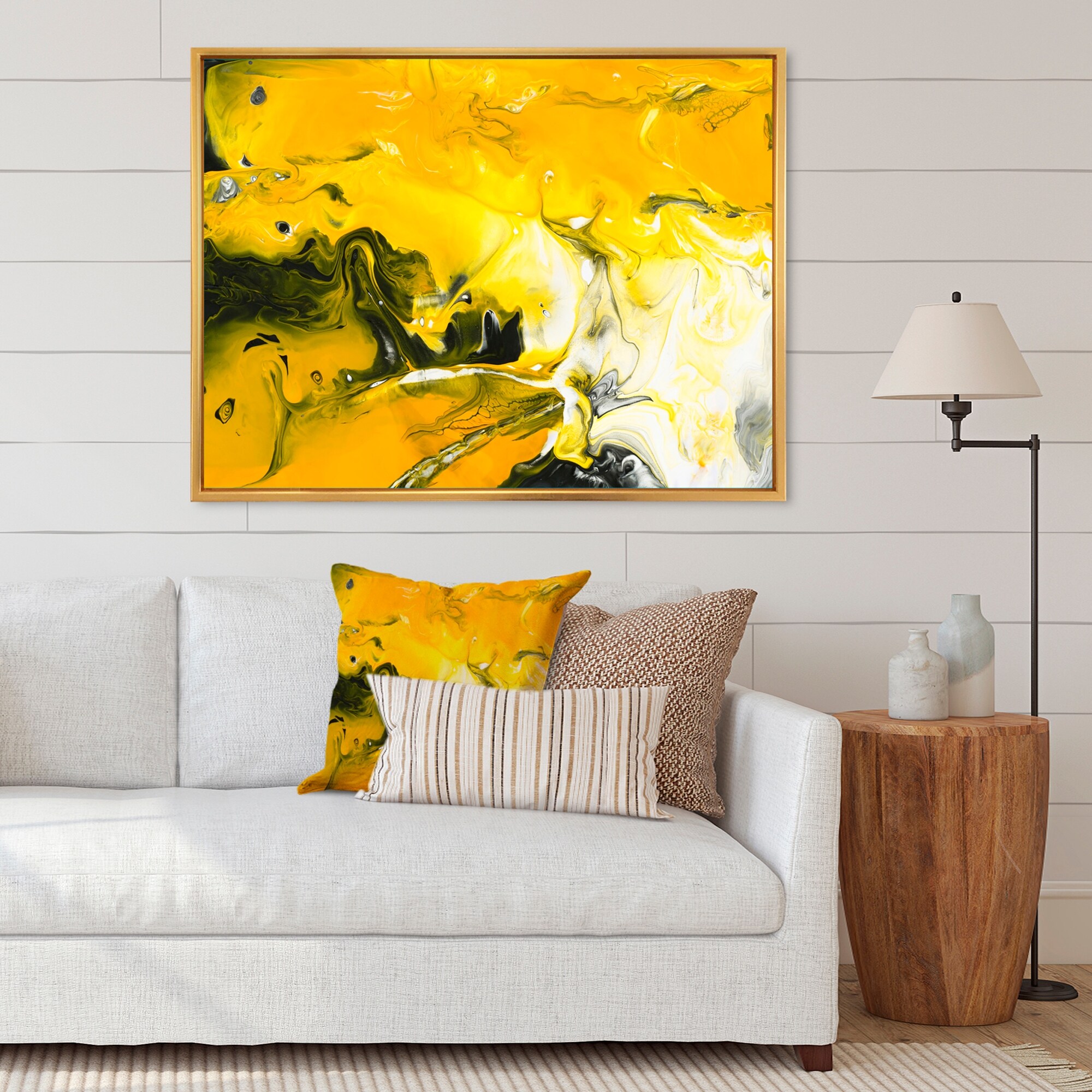 Designart "Yellow Black And White Liquid Art V" Modern Framed Canvas Wall Art Print