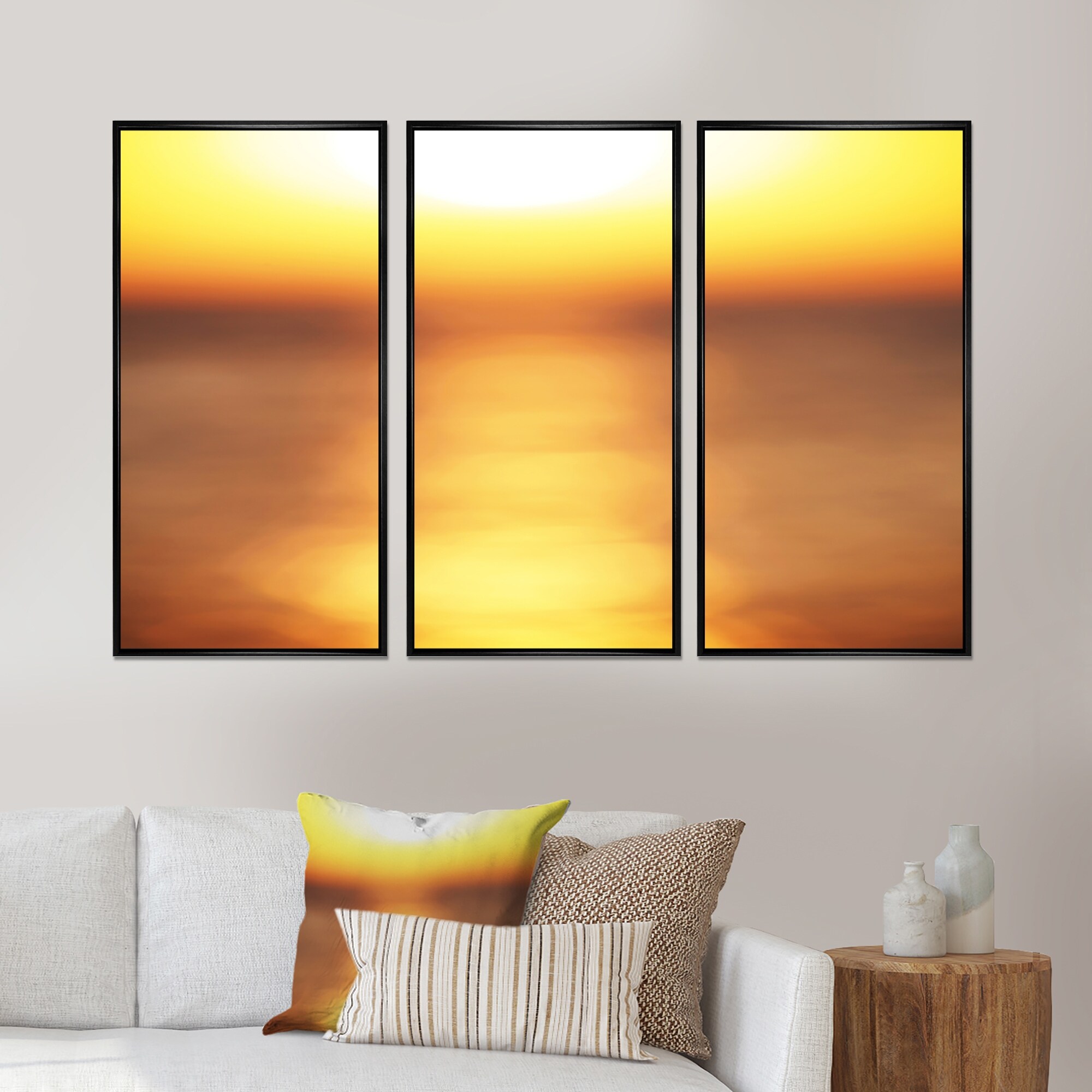 Designart "Abstract Yellow Sunset Reflection" Landscape Framed Artwork Set of 3 - 4 Colors of Frames