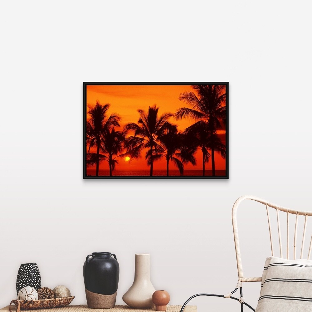 "Palm trees silhouetted by bright yellow sunball, red sunset sky" Black Float Frame Canvas Art