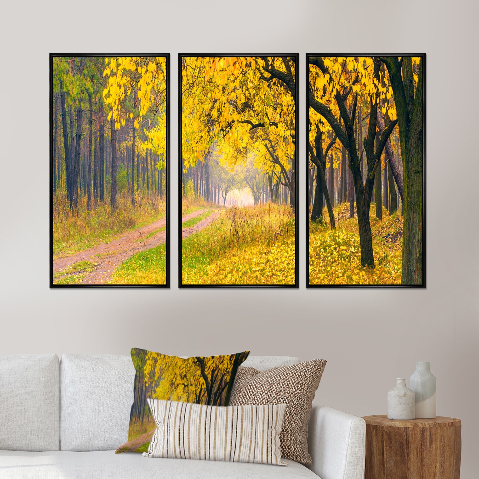 Designart "Bright Yellow Autumn Forest" Landscape Framed Art Prints Set of 3 - 4 Colors of Frames