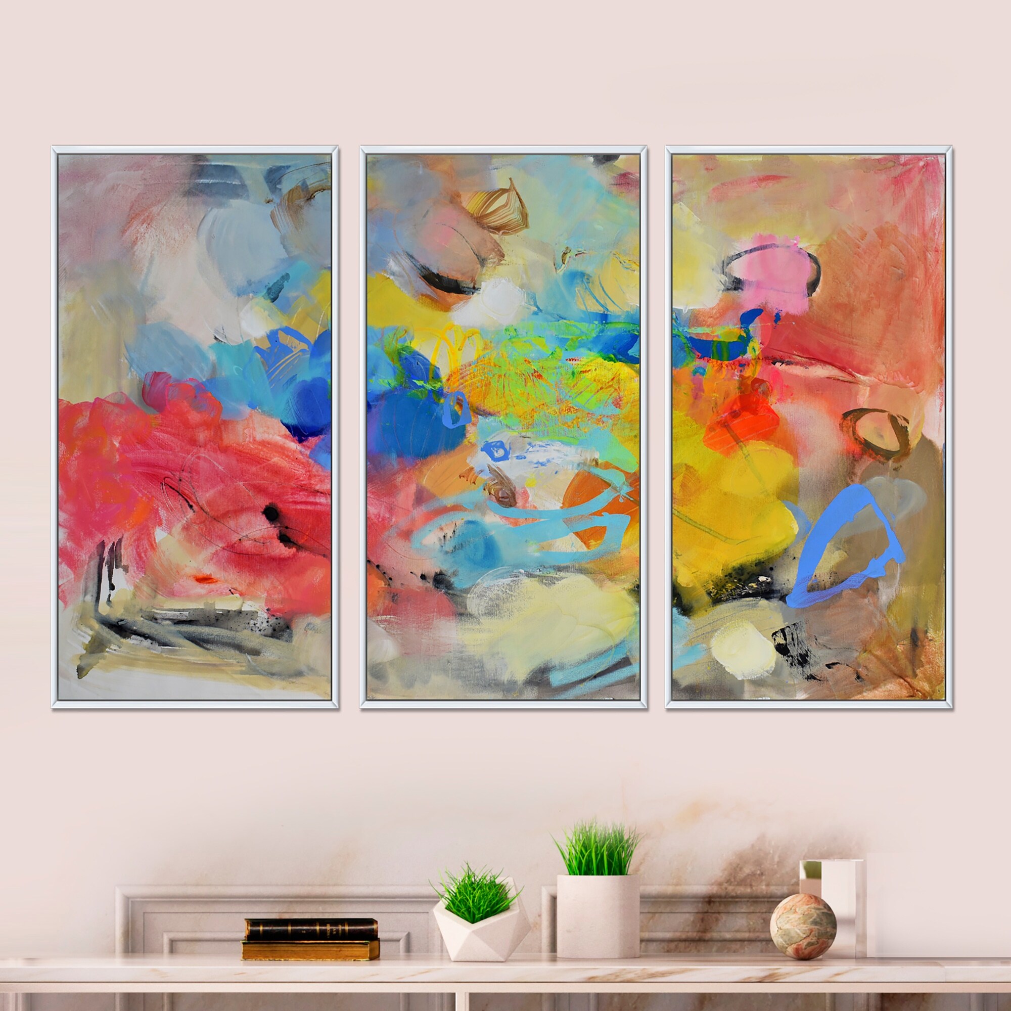 Designart "Energetic Dance of Yellow And Blue" Contemporary Framed Canvas Wall Art Print Set of 3 - 4 Colors of Frames