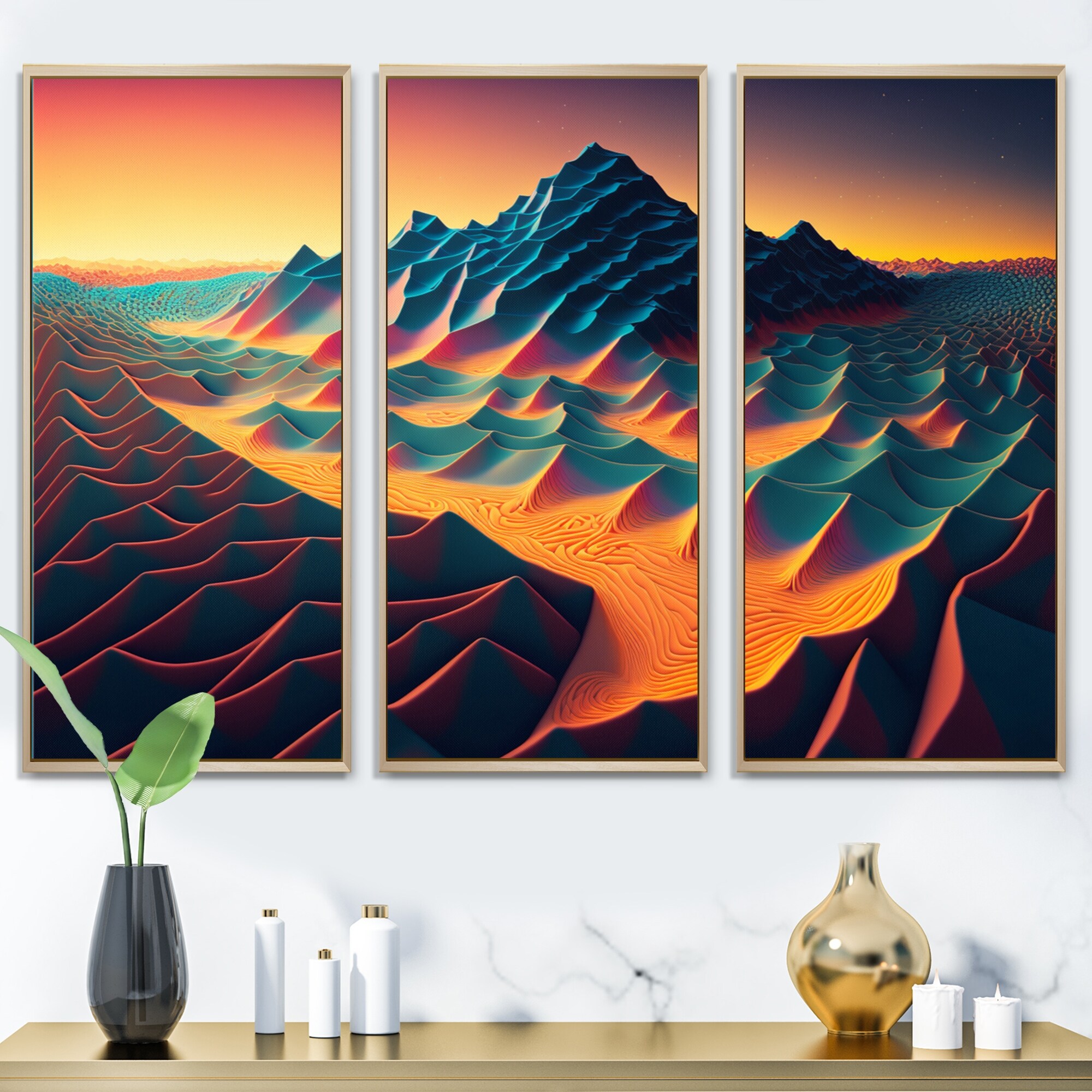 Designart "Abstract Hills in Magenta Yellow And Blue II" Landscape Mountains Framed Canvas Wall Art Print - 3 Panels