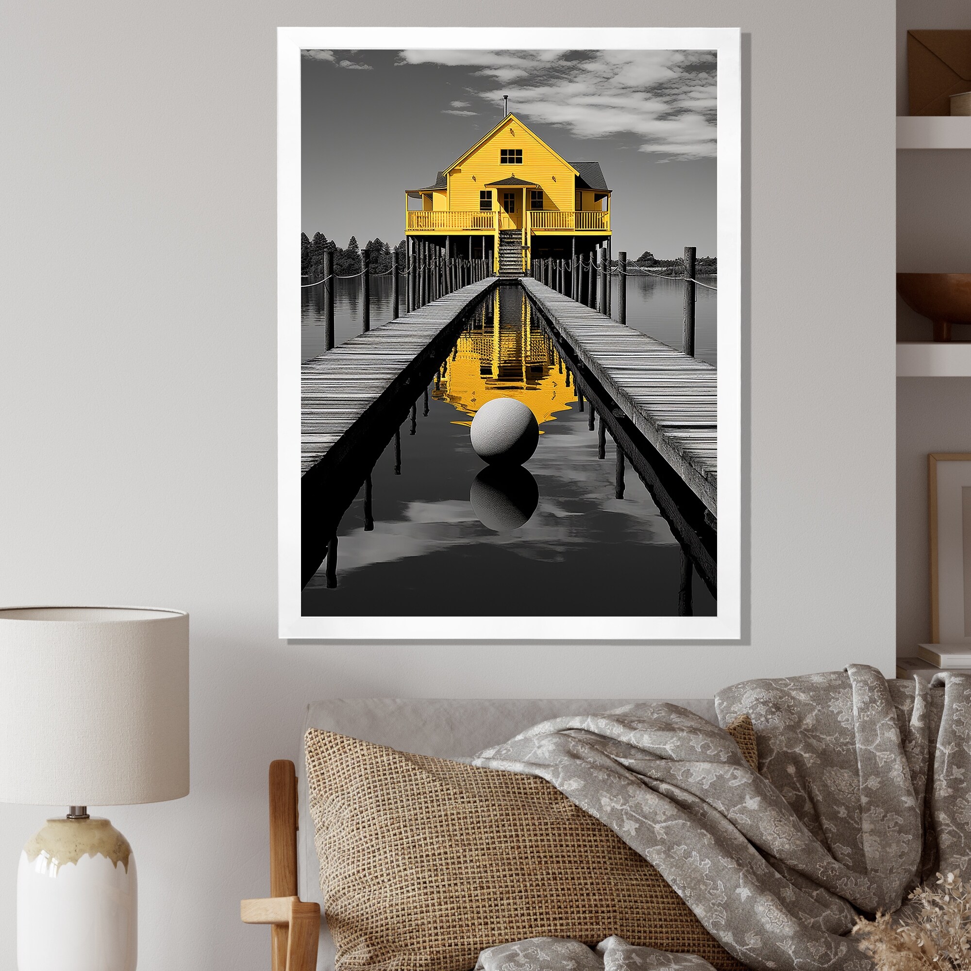 Designart "Yellow Lakehouse Pier Reflections I" Lake House Cottage Framed Canvas Prints