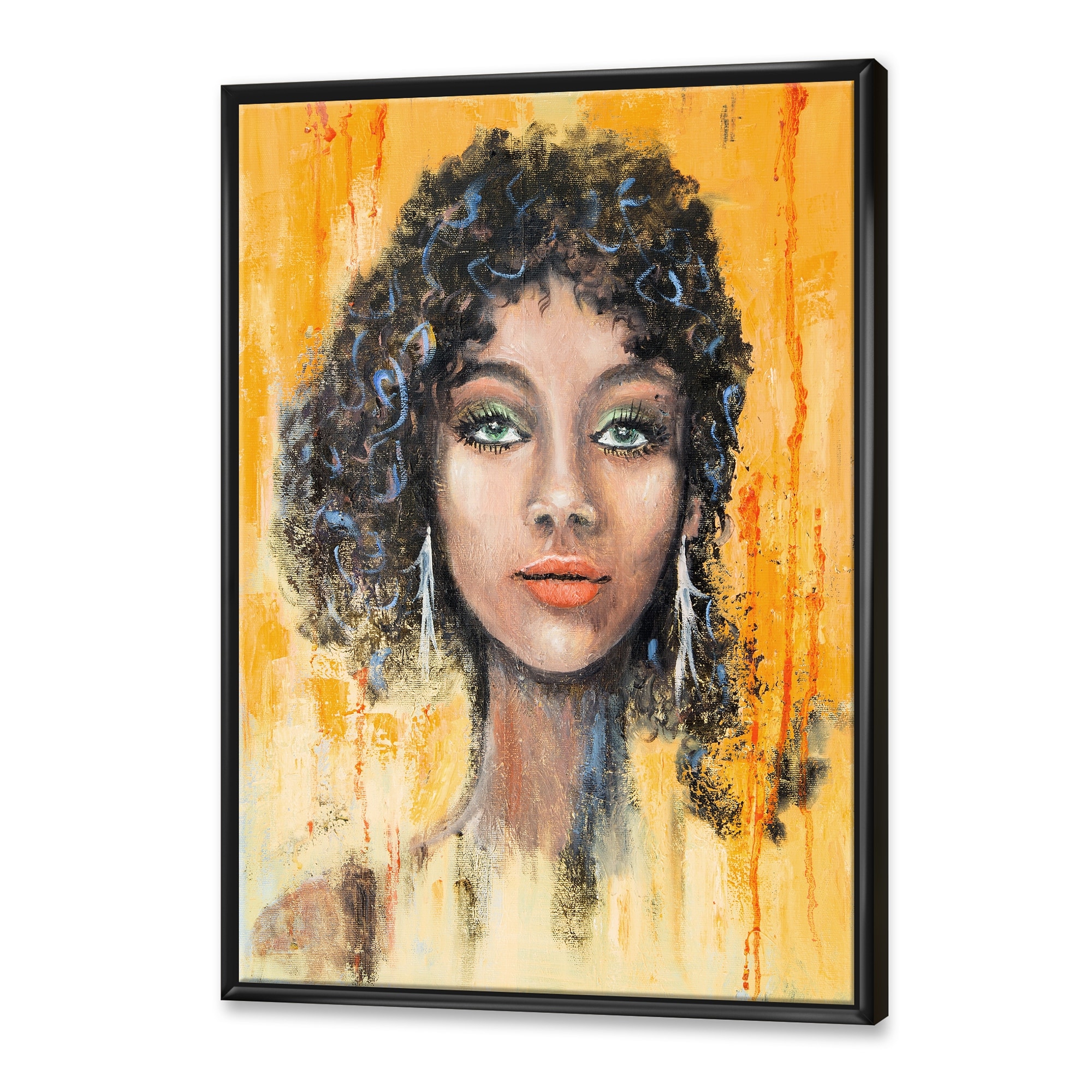Designart "Woman Face With Green Eyes & Black Hair Impression" Modern Framed Canvas Wall Art Print