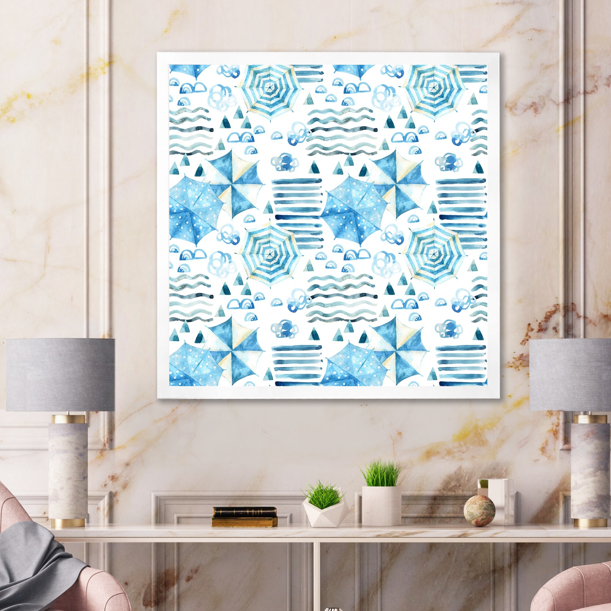 Designart "Vacation Sun With Water Waves Sun And Umbrella III" Patterned Framed Art Print