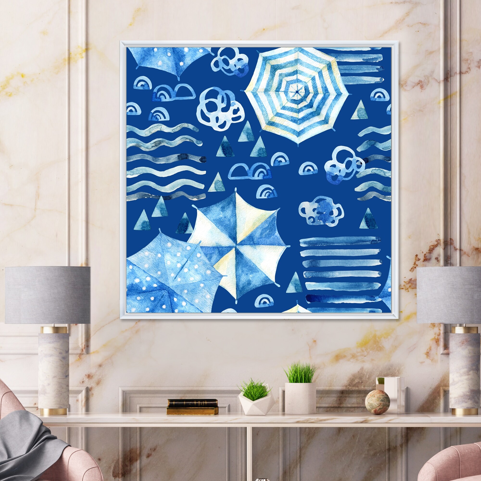 Designart "Vacation Sun With Water Waves Sun And Umbrella V" Patterned Framed Canvas Wall Art Print