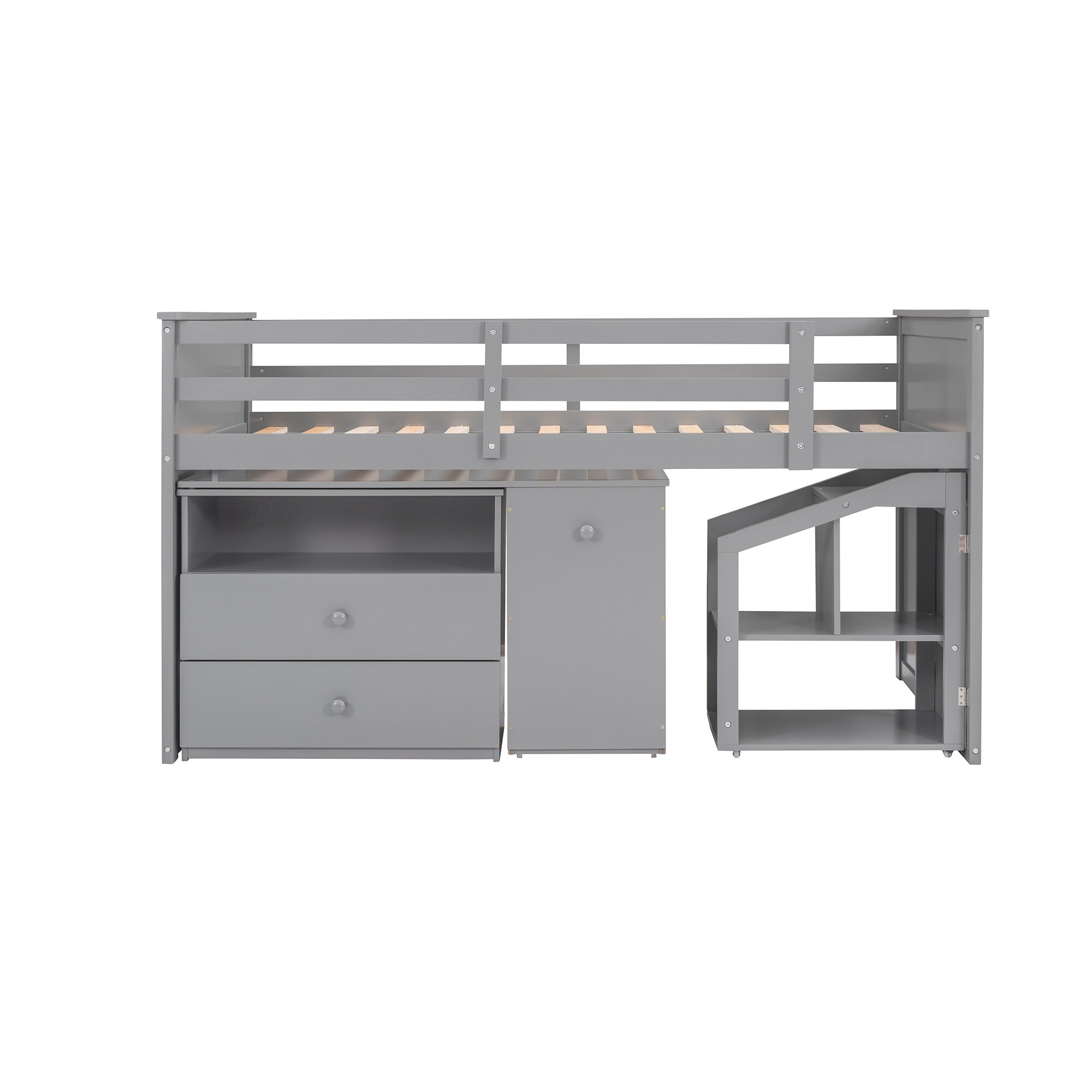 Gray Wood Loft Bed Low Study Twin Size Loft Bed with Storage Steps and Portable Desk, 79.1''L*43.7''W*44.5''H, 194LBS