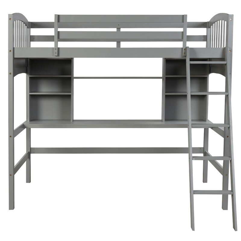 Twin size Loft Bed with Shelves and Desk, Wooden Loft Bed with Desk - Gray