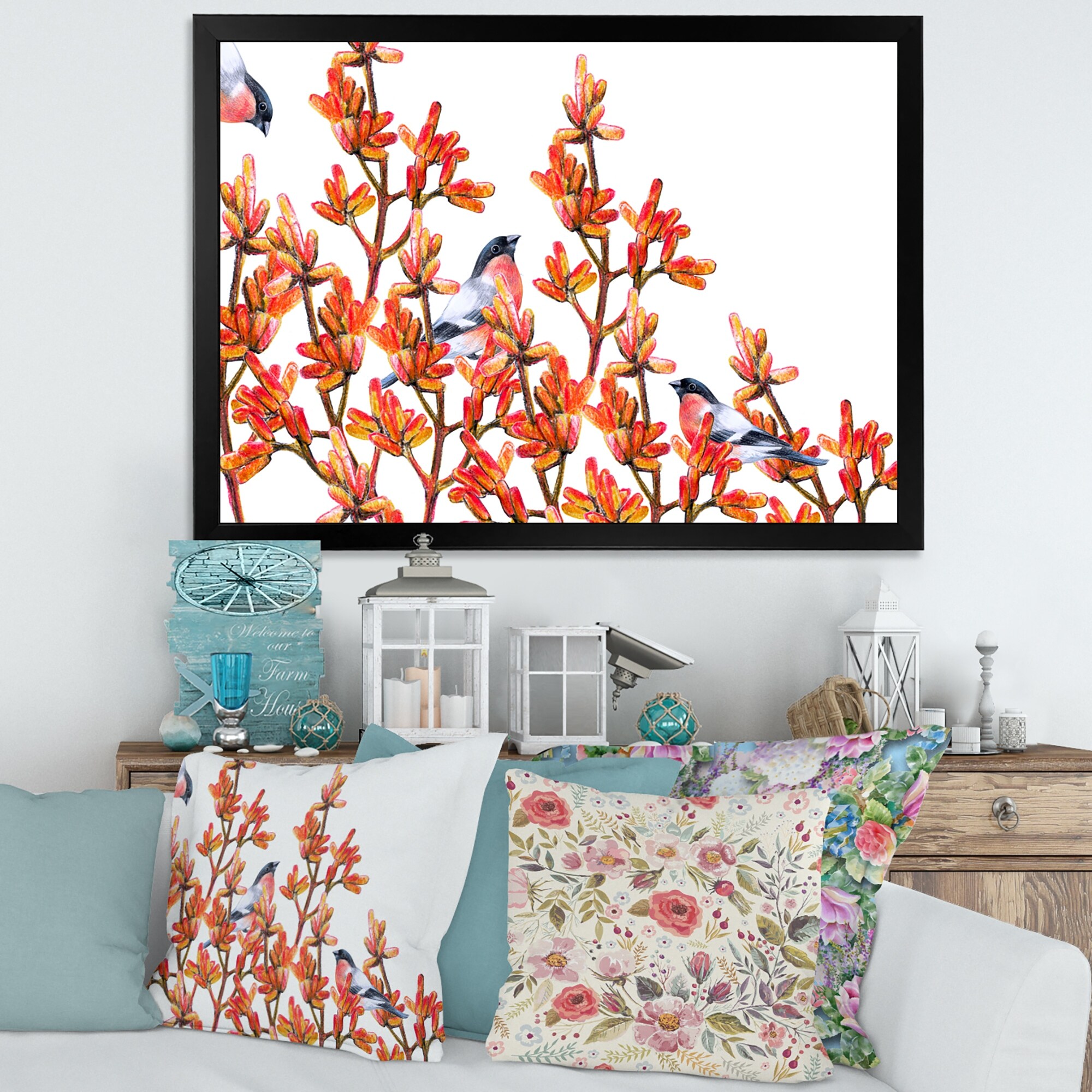 Designart "Flock of Bullfinches Birds on Orange Branches" Traditional Framed Art Print