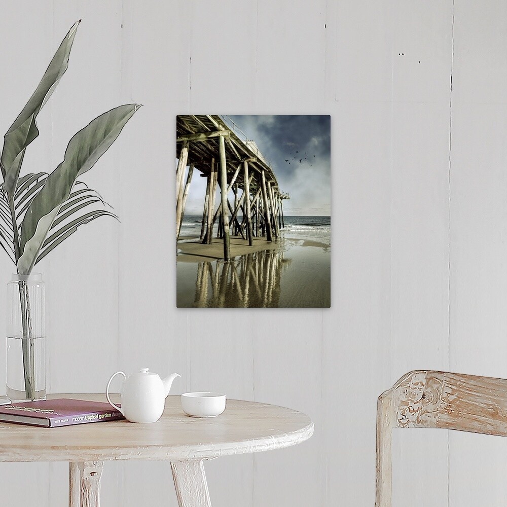 "Fishing shack pier with reflection in sea and flock of birds in sky." Canvas Wall Art