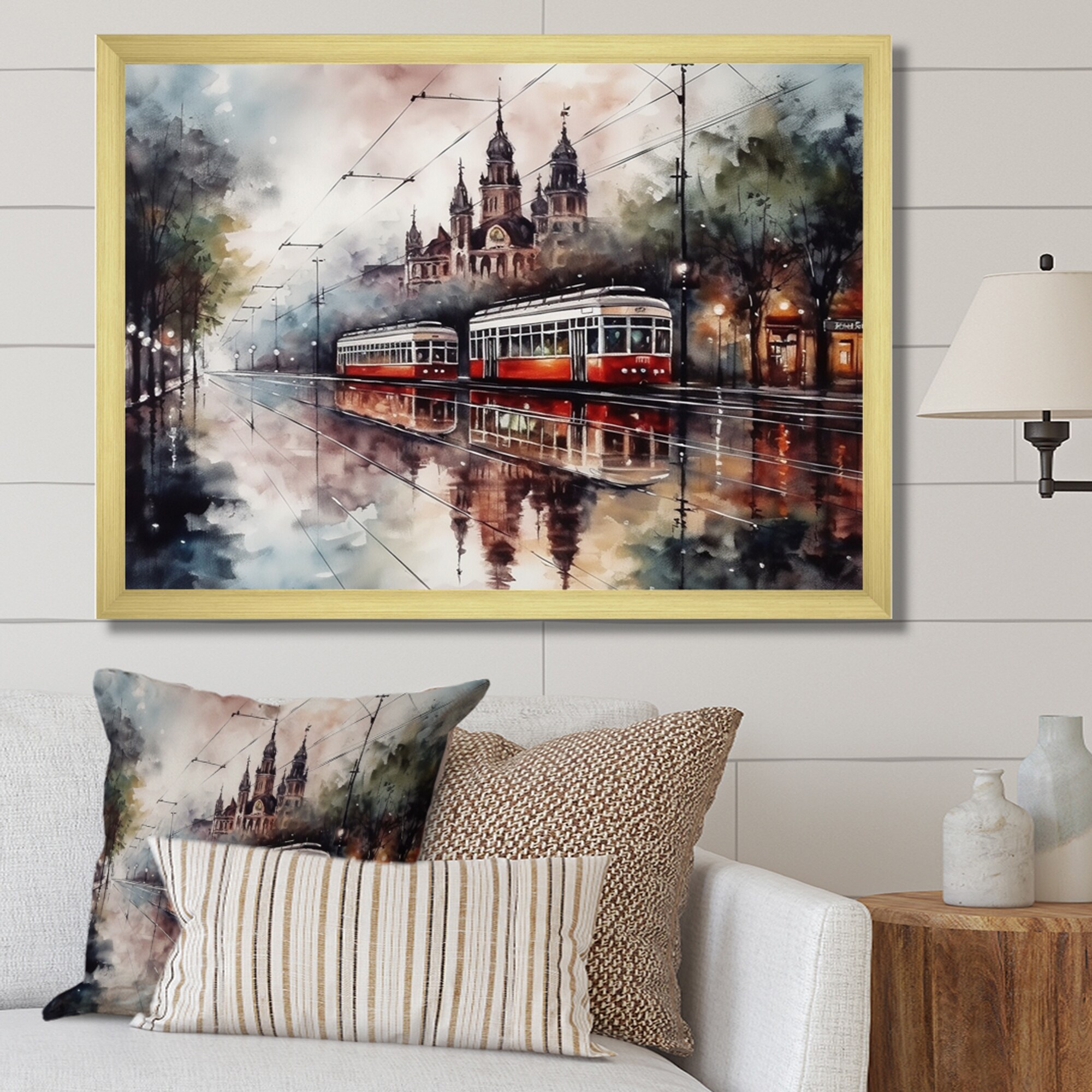 Designart "Red And Brown City Trams in the Wet Mist" City Art Deco Framed Canvas Art Print