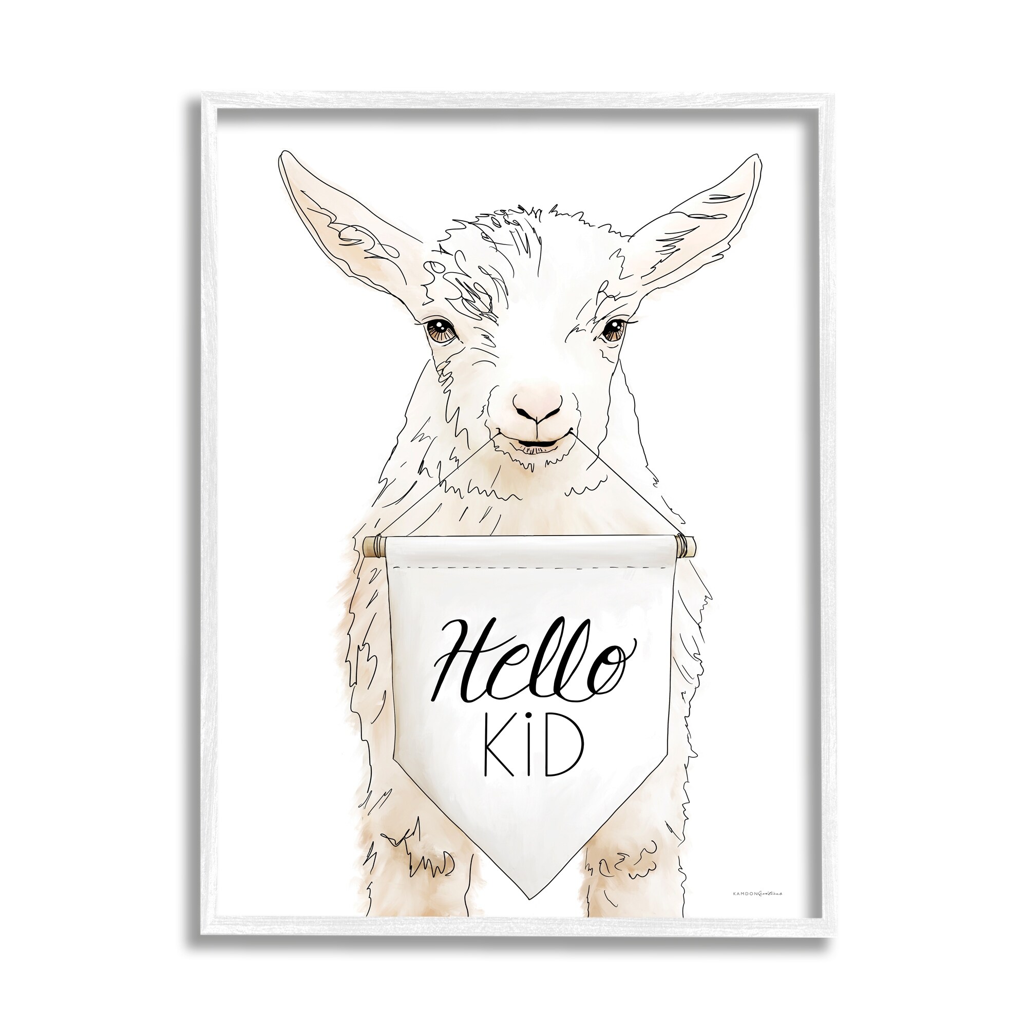 Stupell Goat Holding Sign Hello Kid Text Line Drawing Framed Wall Art - White