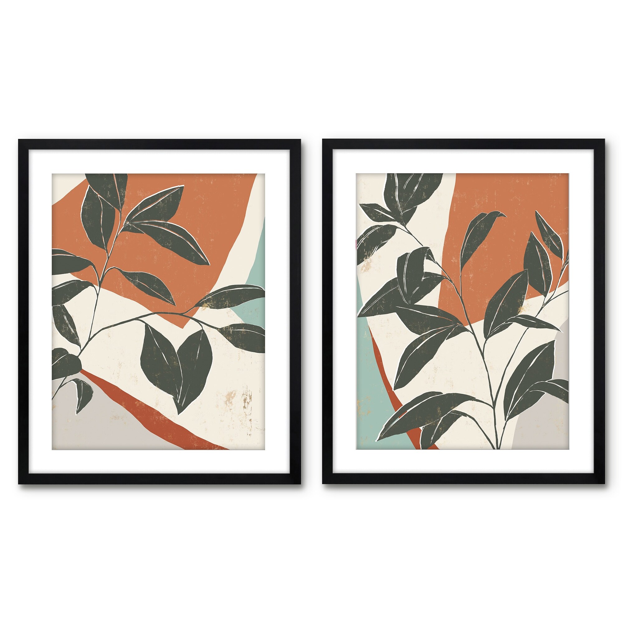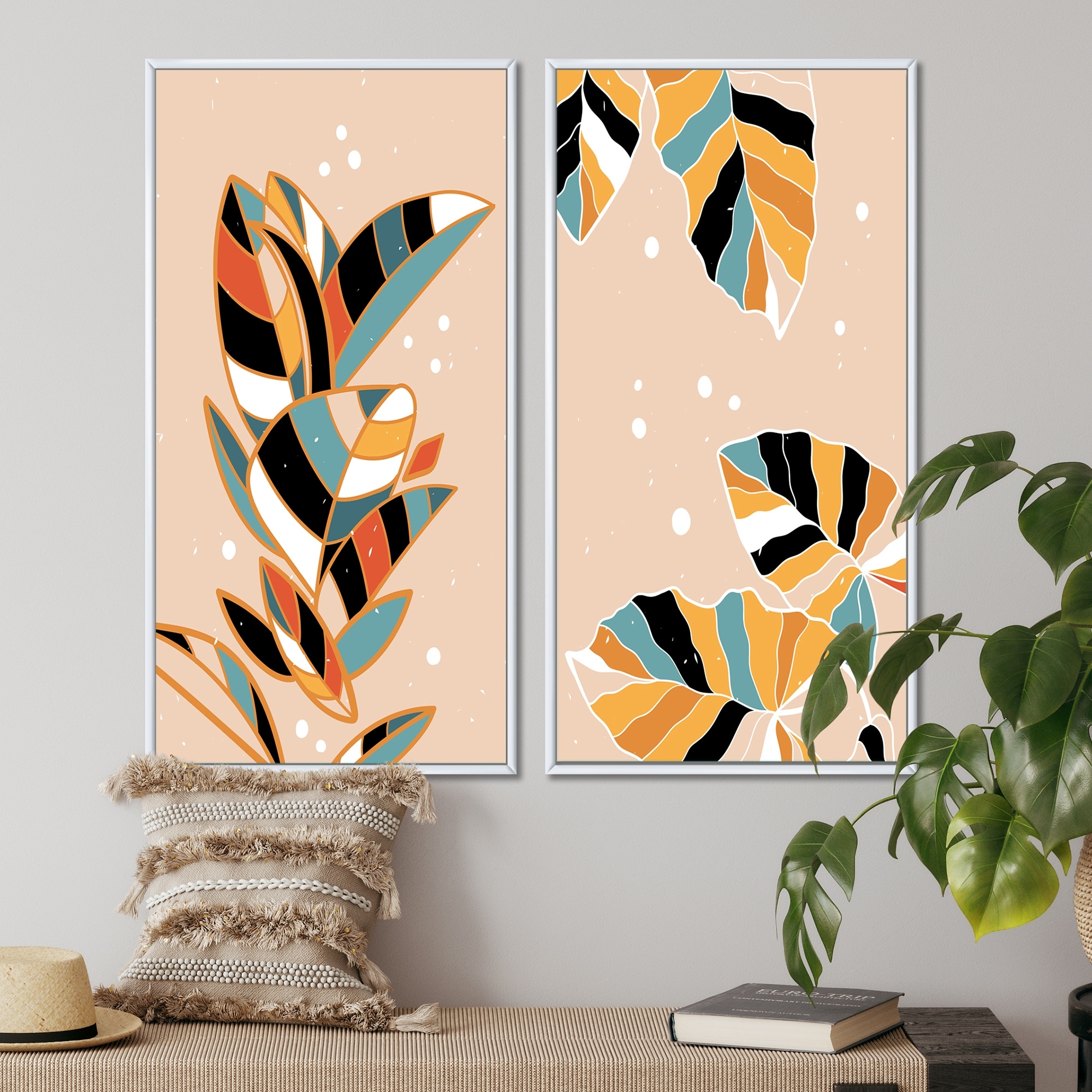 Designart "Orange Botanical Leaves And Flower I" Abstract Framed Art Set of 2 Pieces