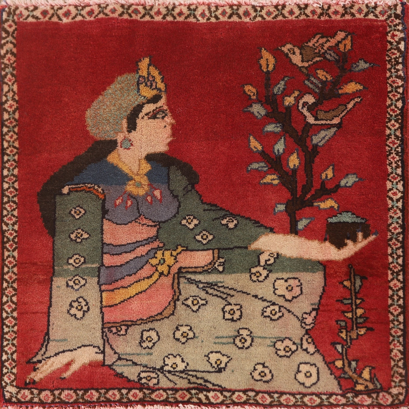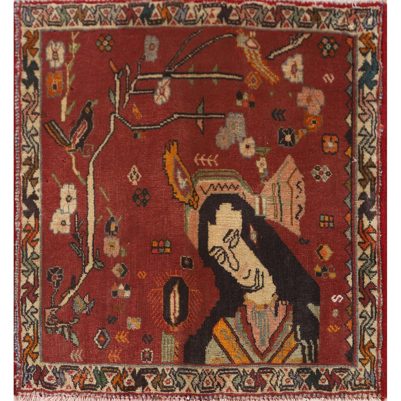 Pictorial Shiraz Persian Vintage Square Rug Handmade Red Wool Carpet - 2'1" x 2'2"