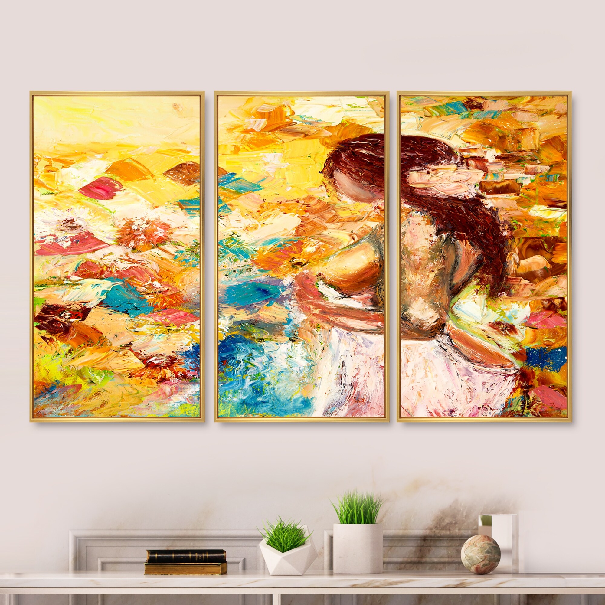Designart "Yellow Painted Impression of Girl With Flower in Hair" Modern & Contemporary Framed Canvas Wall Art Print - 3 Panels
