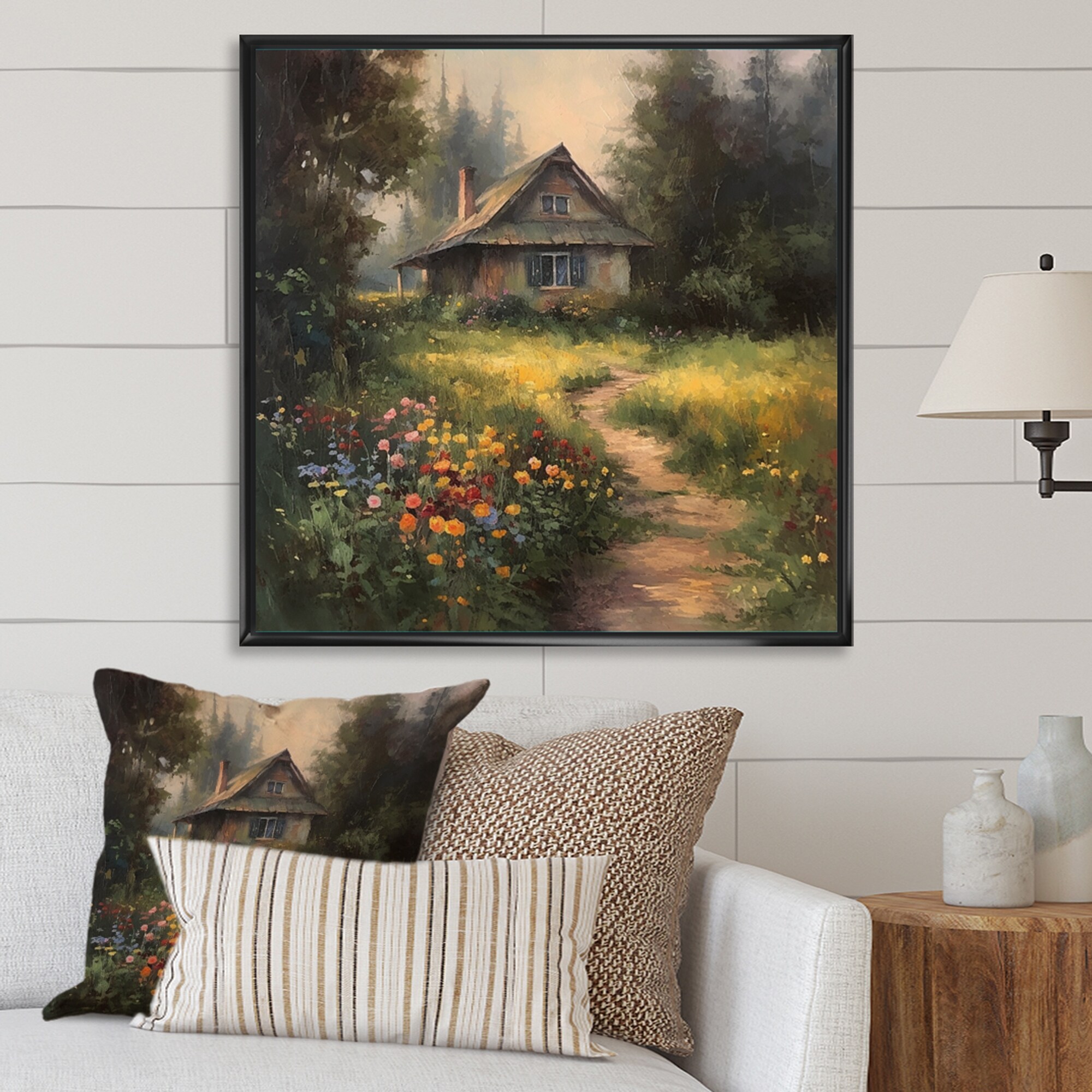 Designart "Quaint Cottage And Garden Oasis I" Cottage Landscape Framed Canvas Art Print