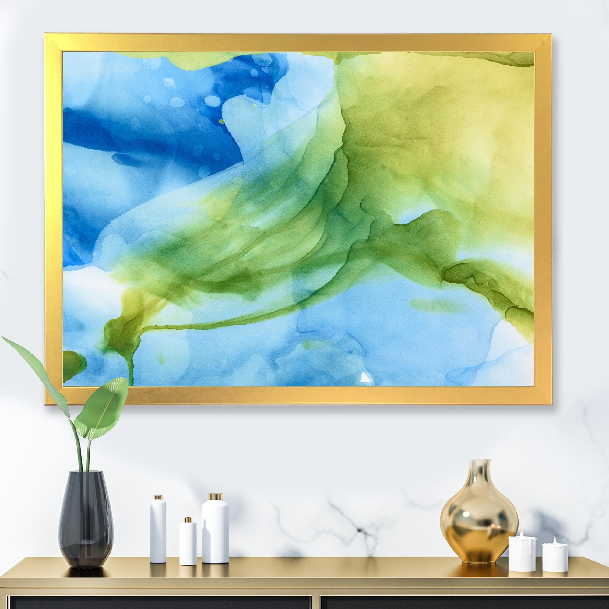 Designart "Green Blue Splashes Inks" Abstract Framed Art Print
