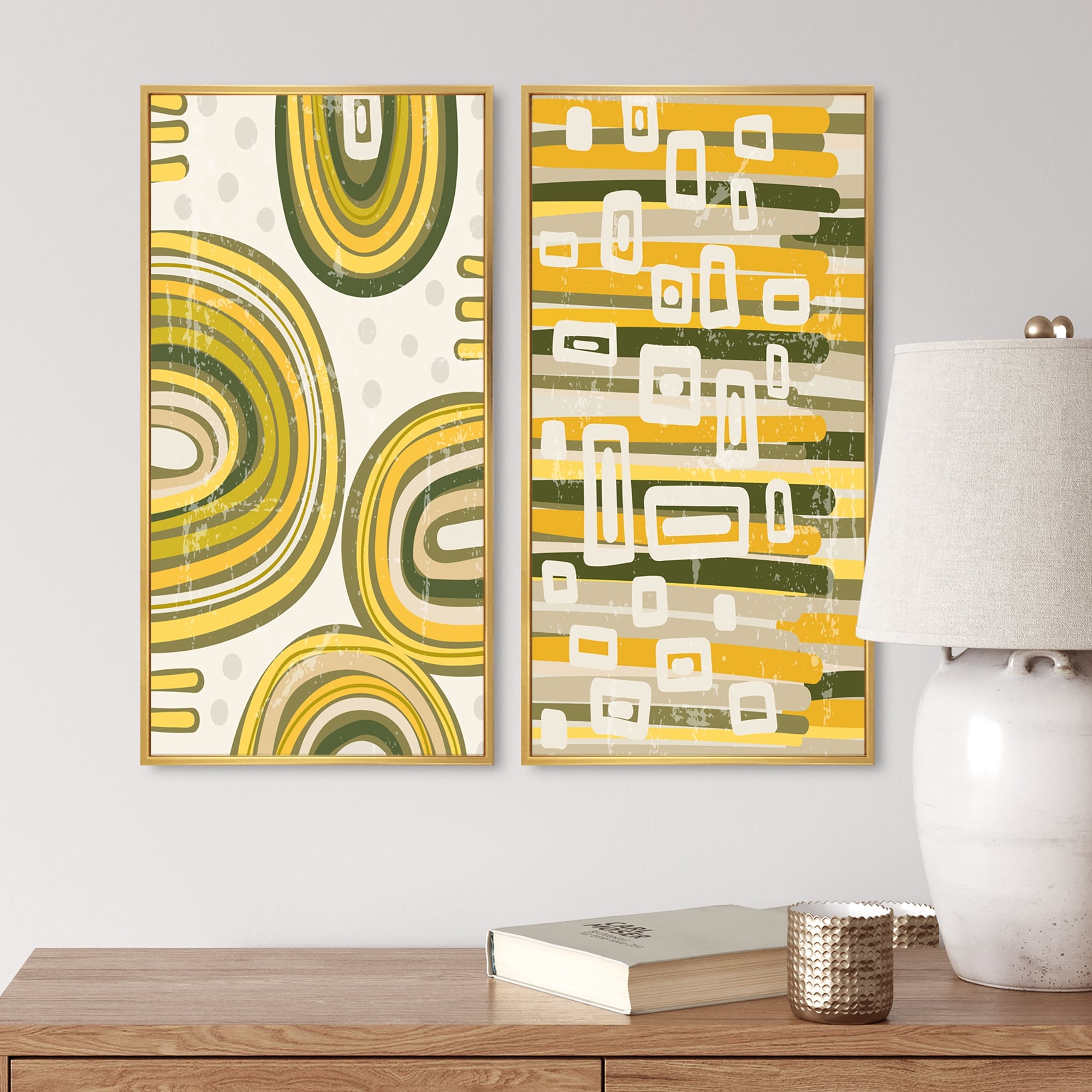 Designart "Abstract Geometric Shapes in Retro Colors III" Geometric Framed Art Set of 2 Pieces