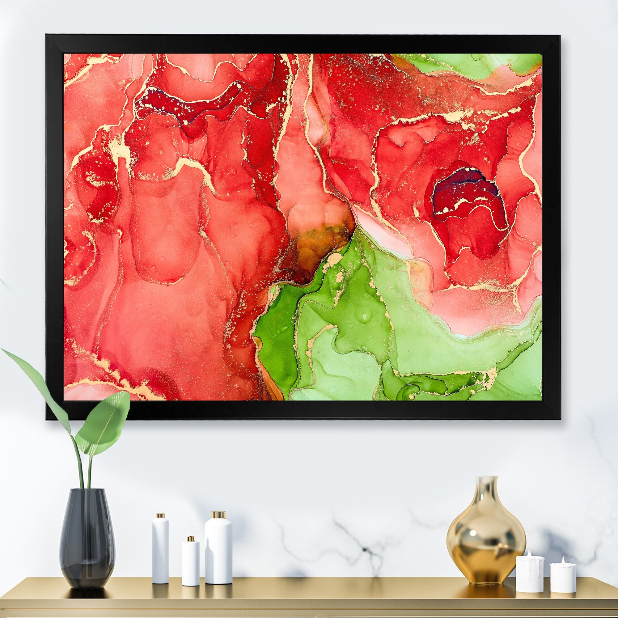 Designart "Red And Green Luxury Abstract Fluid Art" Modern Framed Art Print