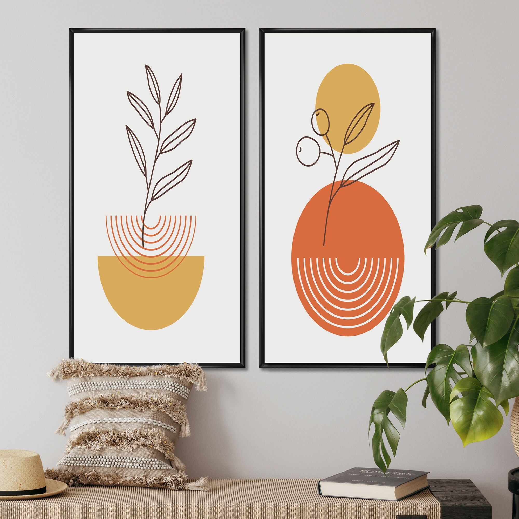 Designart "Creative Retro Geometrics With Full Moon II" Abstract Framed Art Set of 2 Pieces