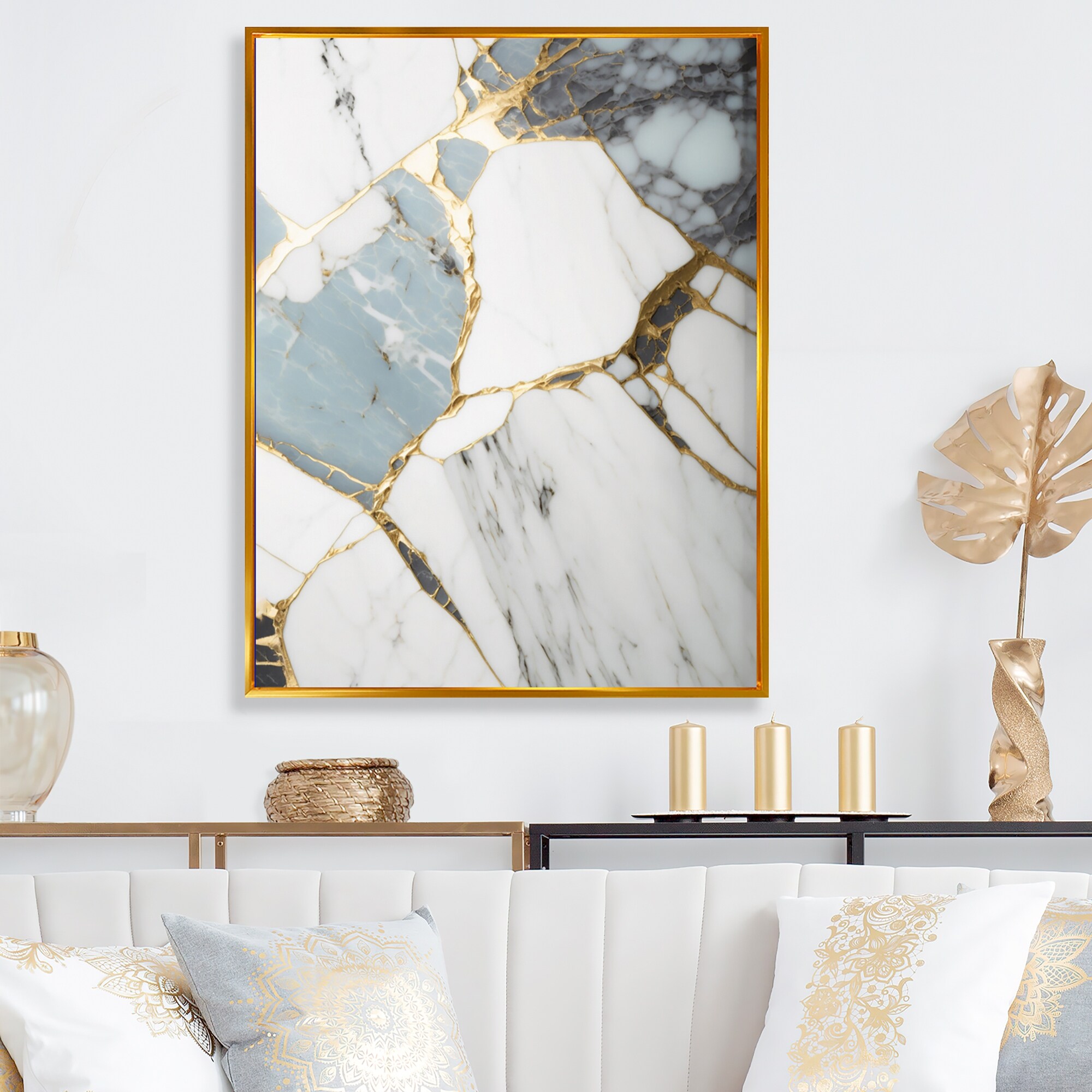 Designart "Abstract Geode Gold And White Marble I" Marble Abstract Framed Canvas Art Print