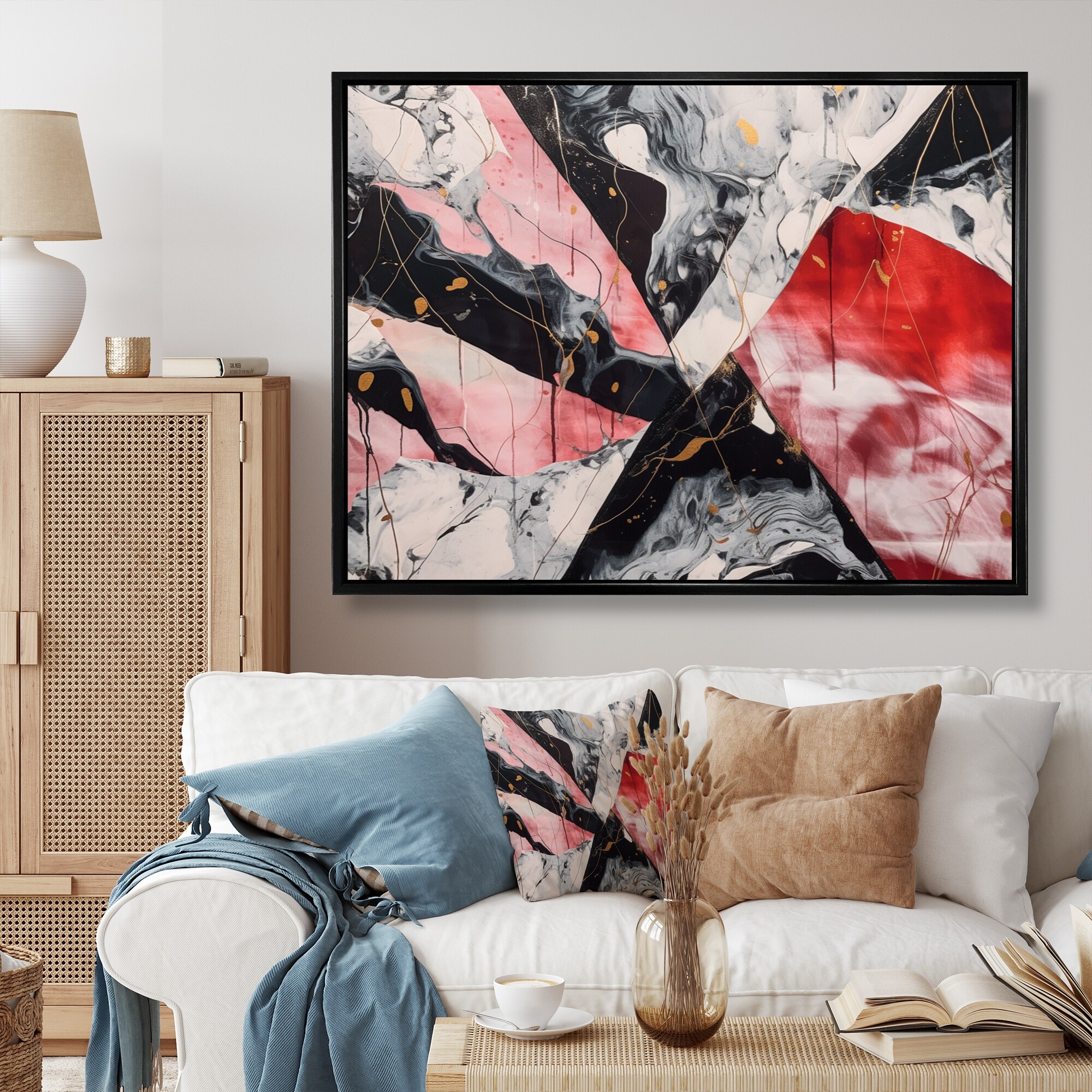 Designart "Red And Black Marble Whispers Ii" Abstract Marble Framed Wall Art for Living Room