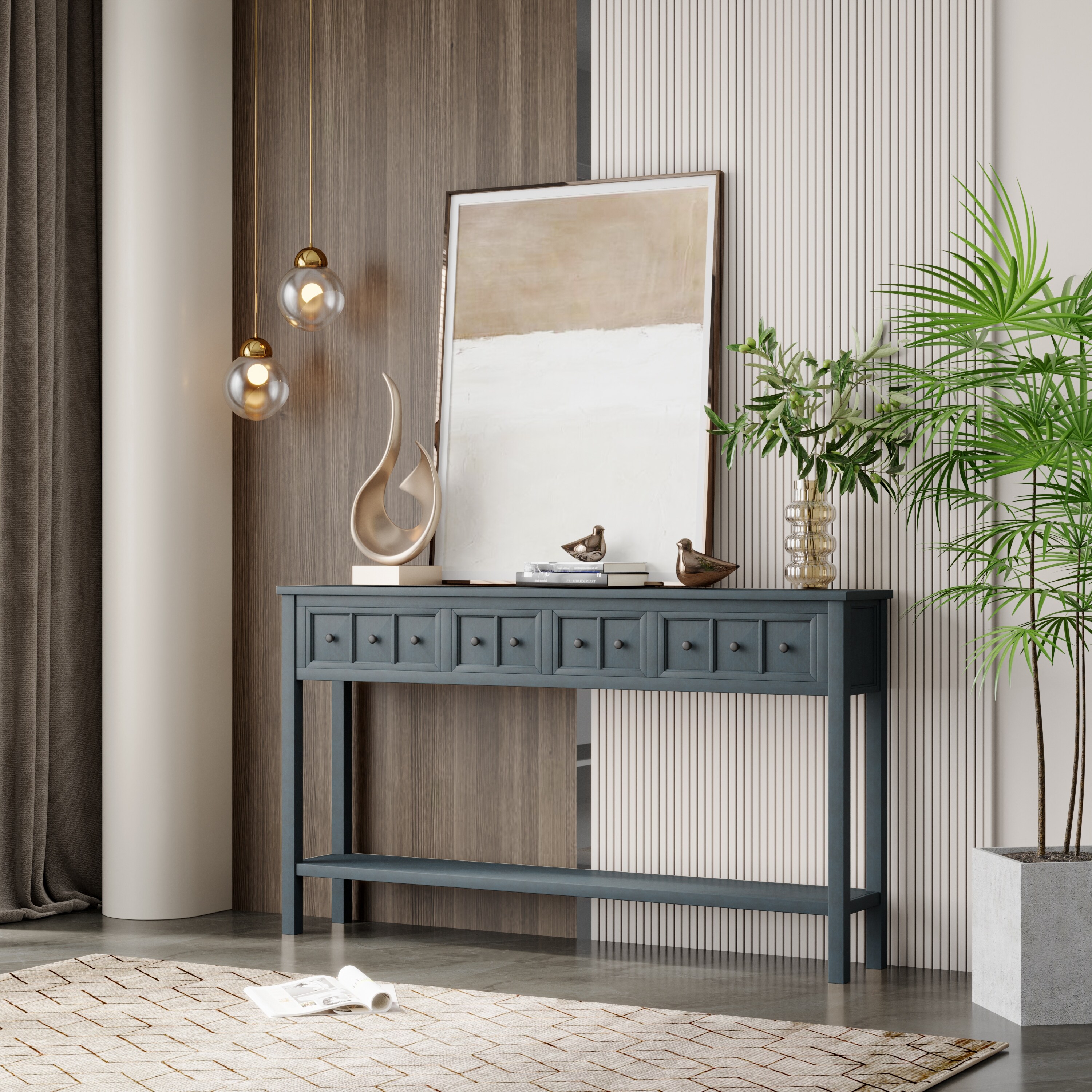 Brushed Texture Console Table with 4 Drawers & Open Bottom Shelf, Classic Rustic Solid Wood Entryway Table Side Table Sofa Table