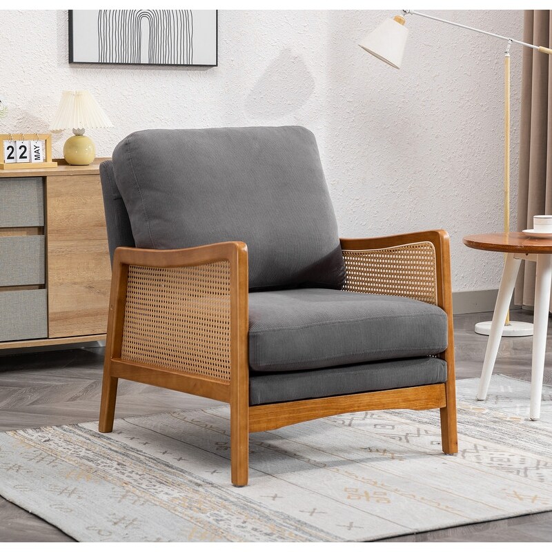 22" W Velvet Upholstered Accent Chair with Natural Rattan Arms Grey - Accent Chairs