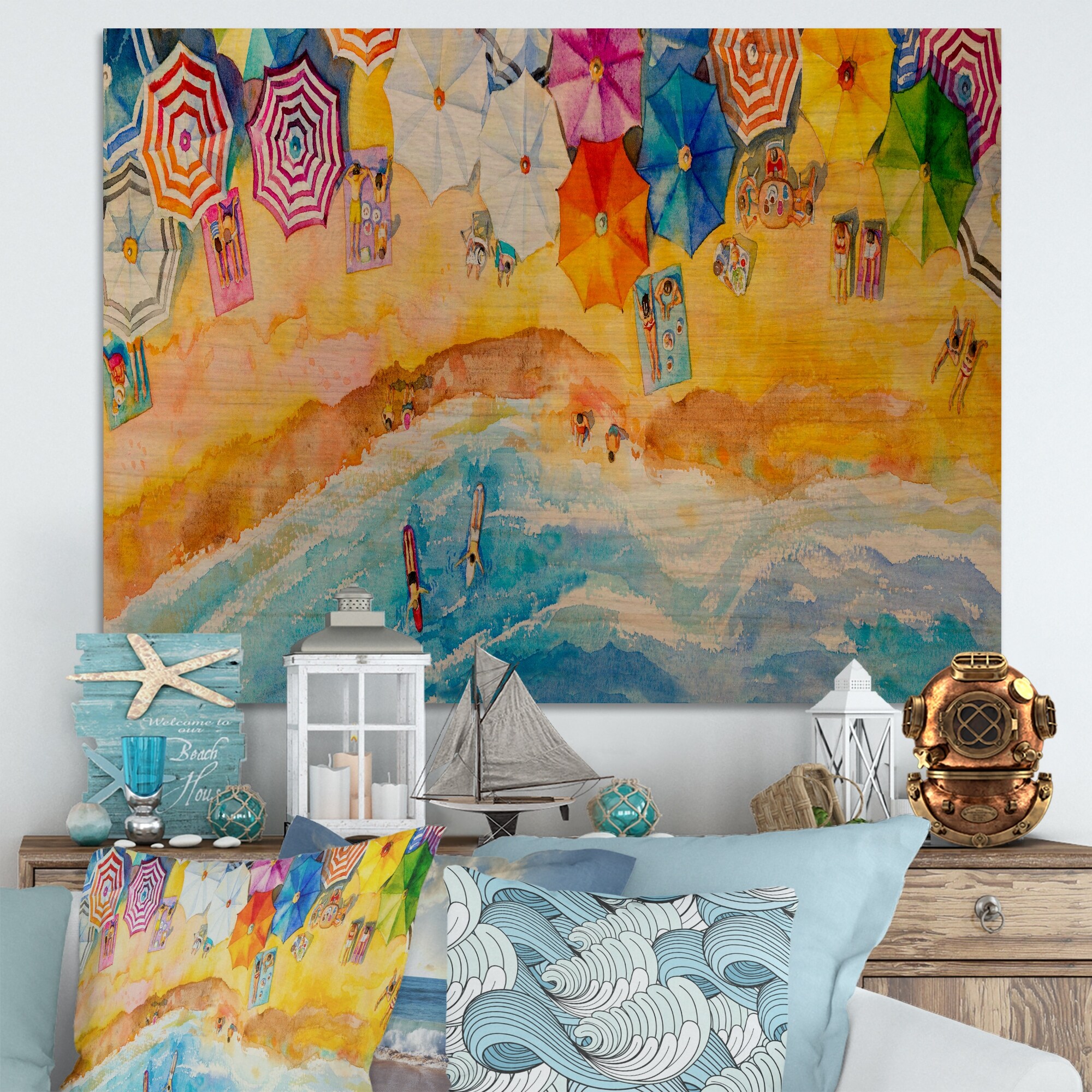 Designart 'Aerial Pastel Beach California' Nautical & Coastal Wood Wall Art - Natural Pine Wood