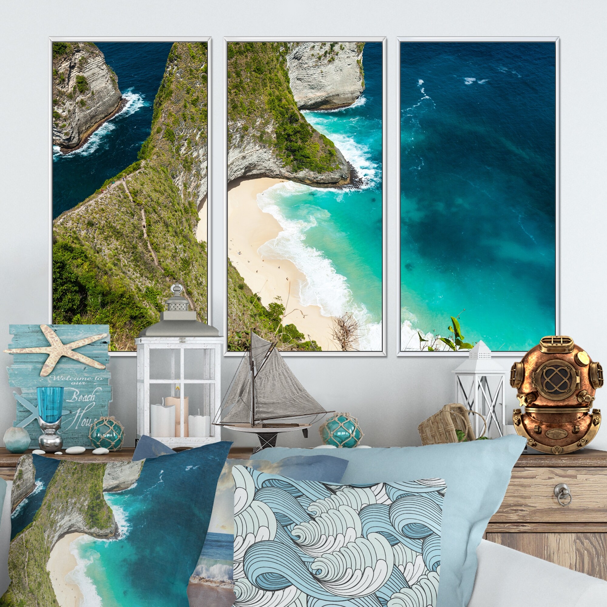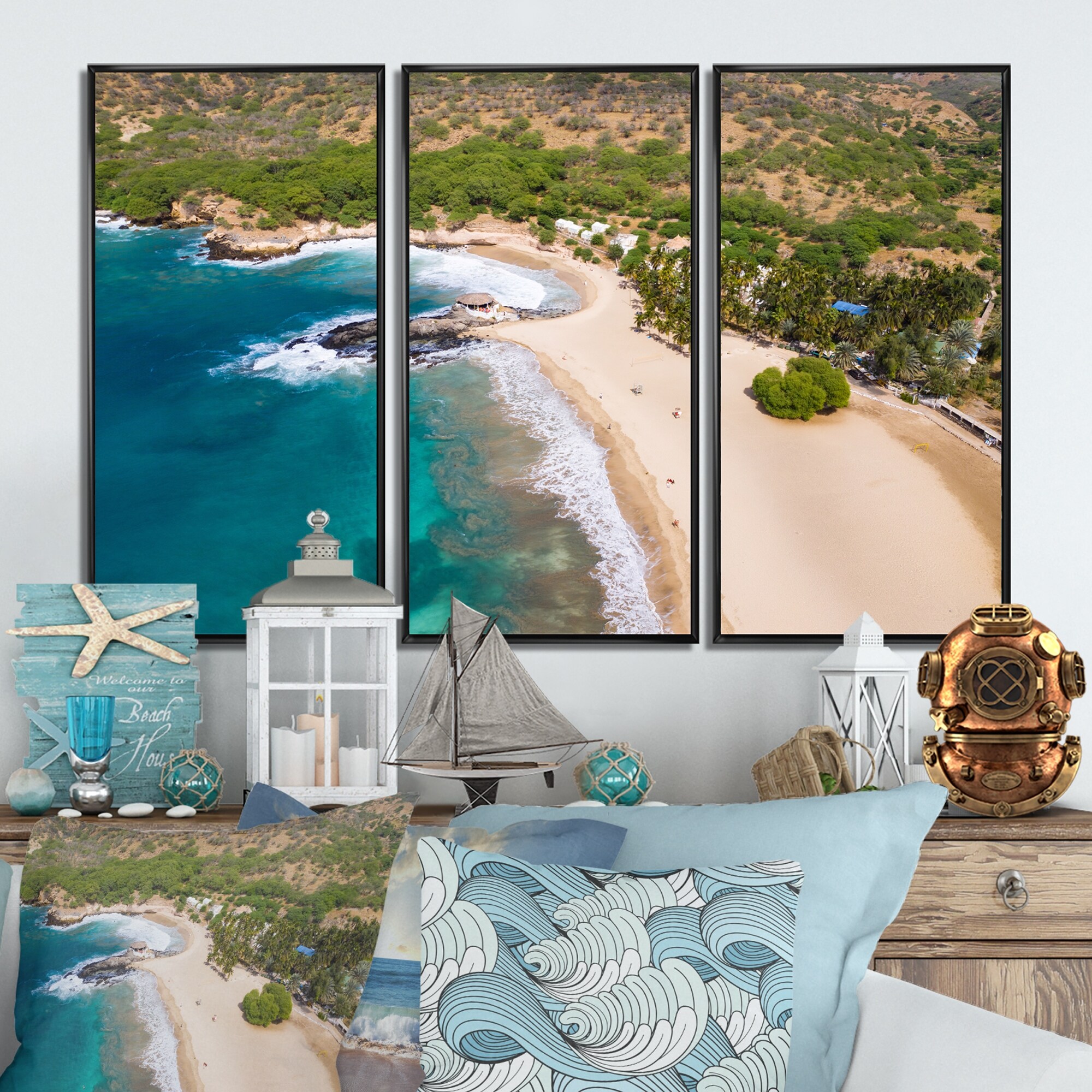 Designart "Aerial View of Tropical Beach I" Nautical & Coastal Framed Canvas Wall Art Set of 3 - 4 Colors of Frames