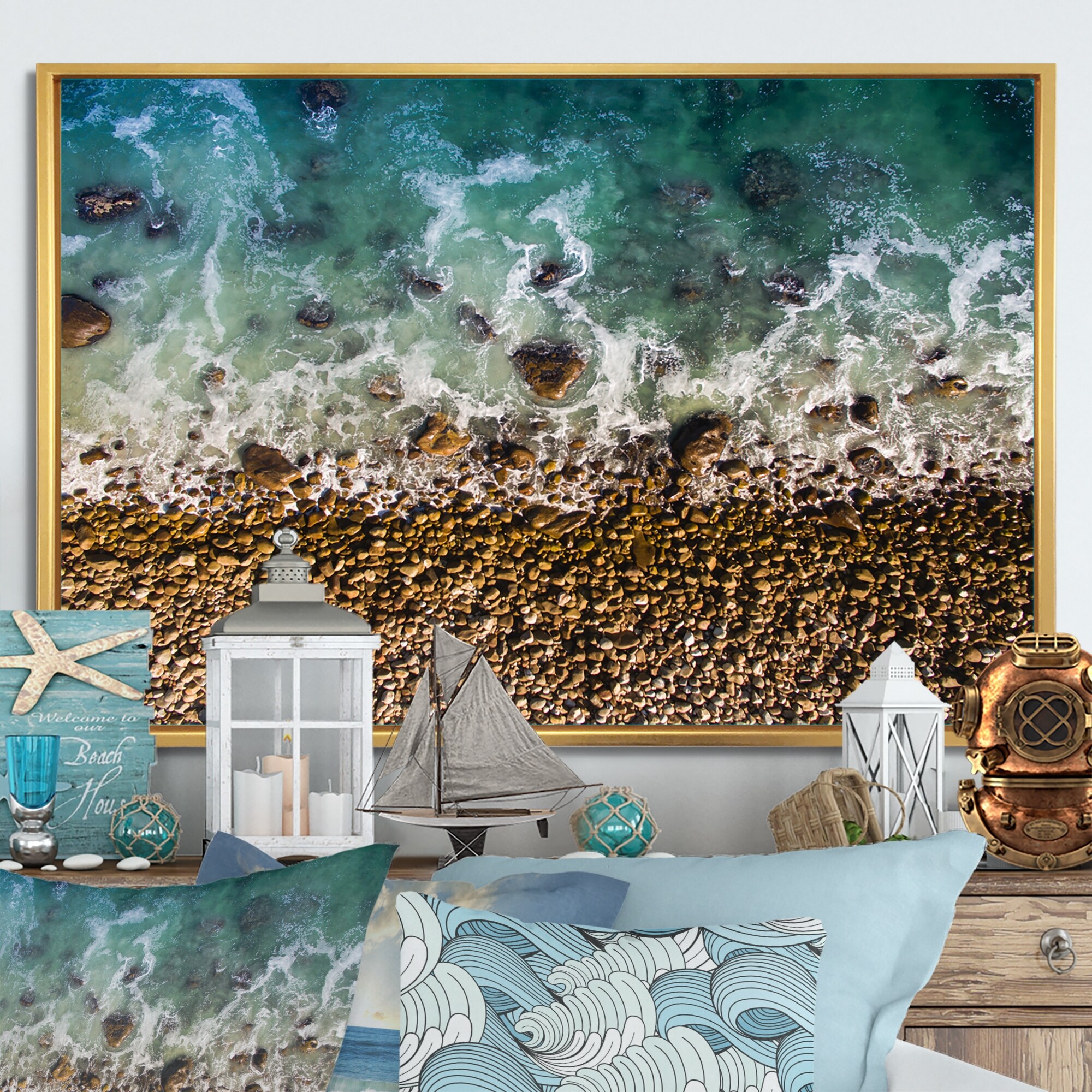 Designart "Beach Rocks And Shore Aerial View" Nautical & Coastal Framed Canvas Art Print