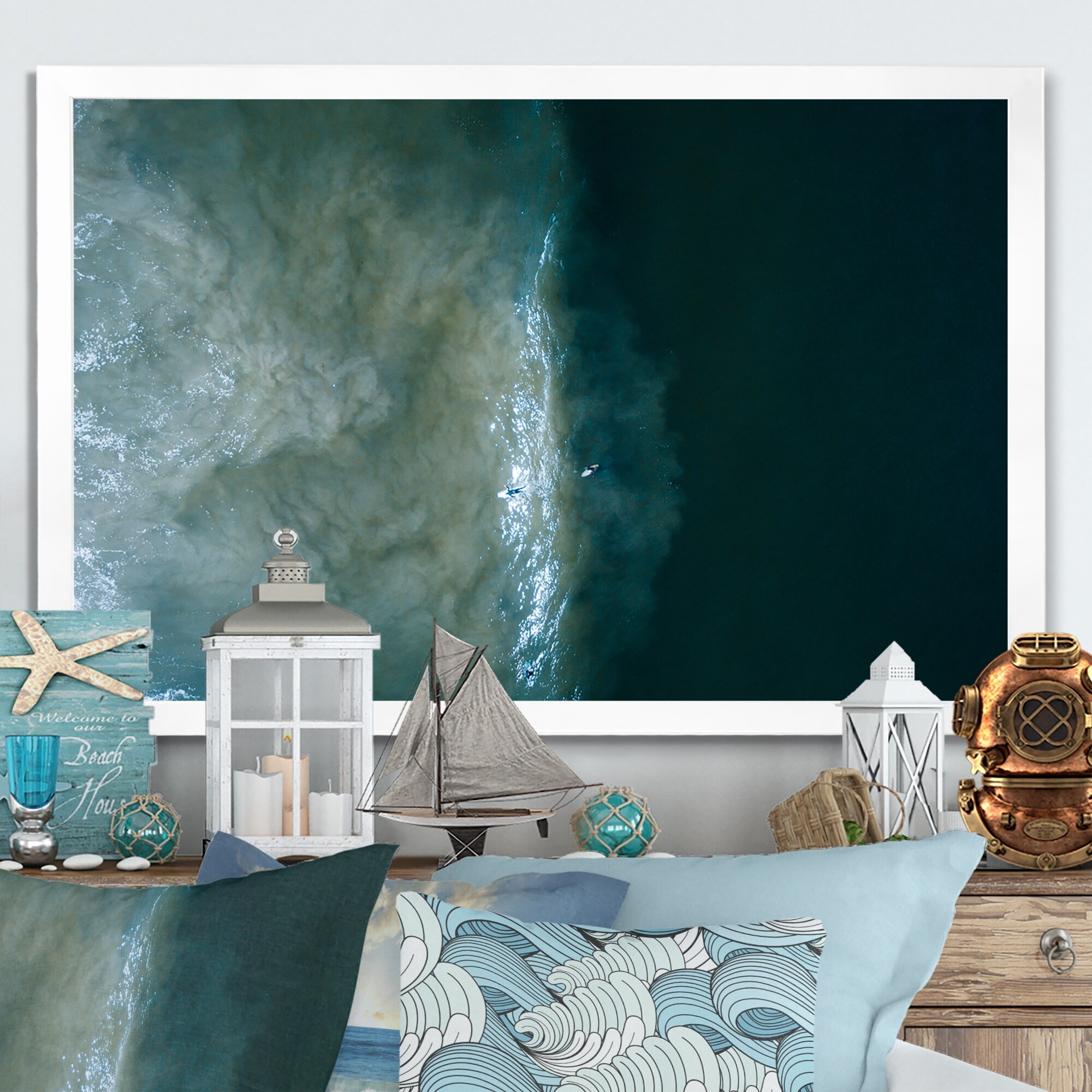 Designart "Aerial View Blue Ocean Waves II" Nautical & Coastal Framed Wall Art