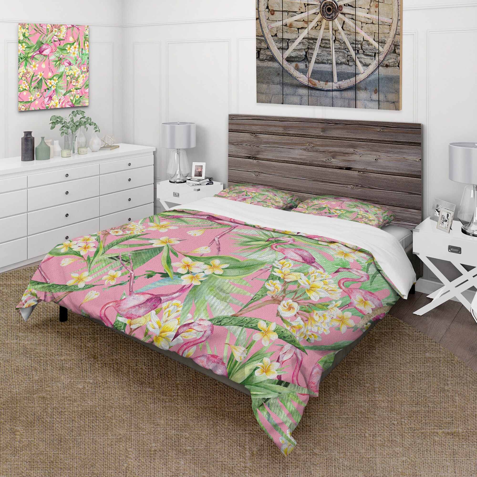 Designart 'Tropical Foliage, Yellow Flowers With Flamingo III' Modern Duvet Cover Set