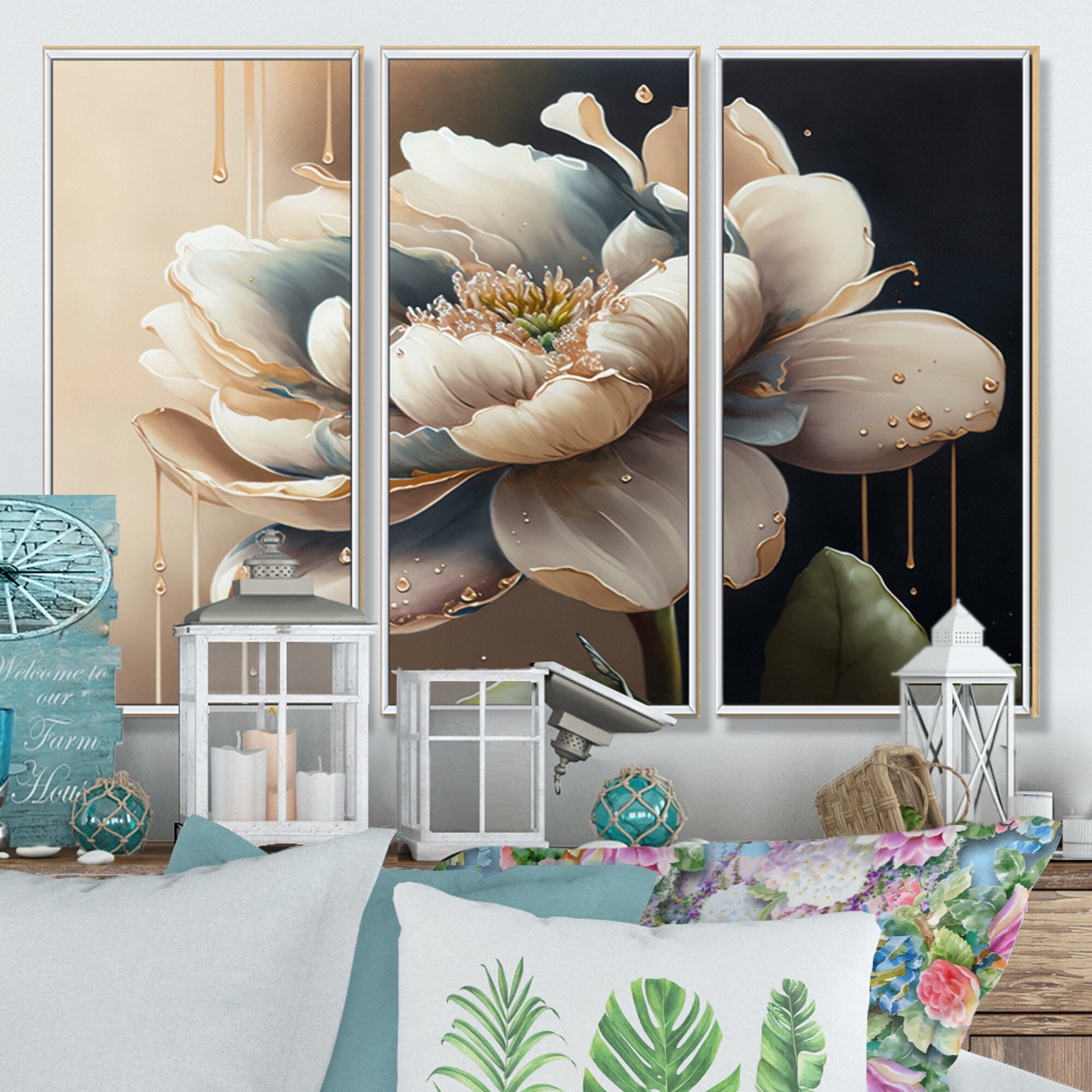 Designart "Cream White Flower " Floral Framed Canvas Art Print - 3 Panels