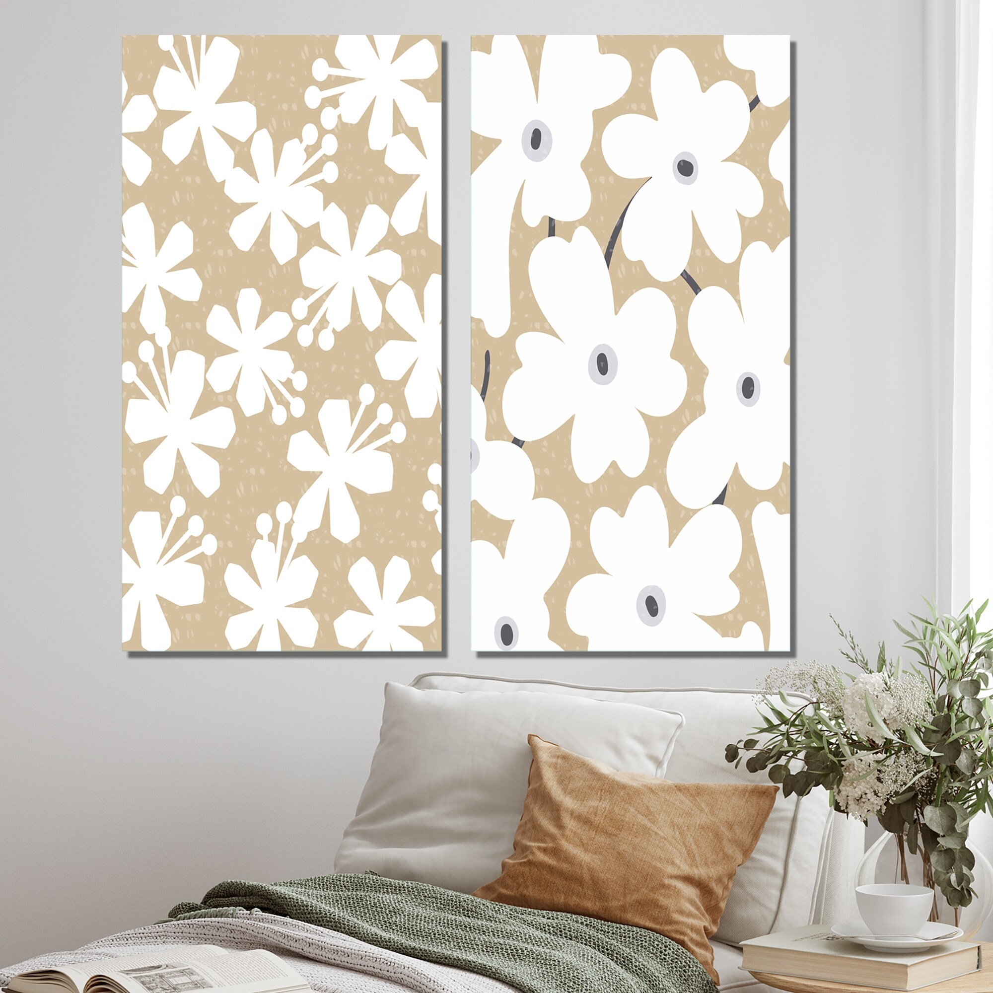 Designart 'White Minimalistic Abstract Flowers Silhouettes I' Floral Set of 2 Pieces