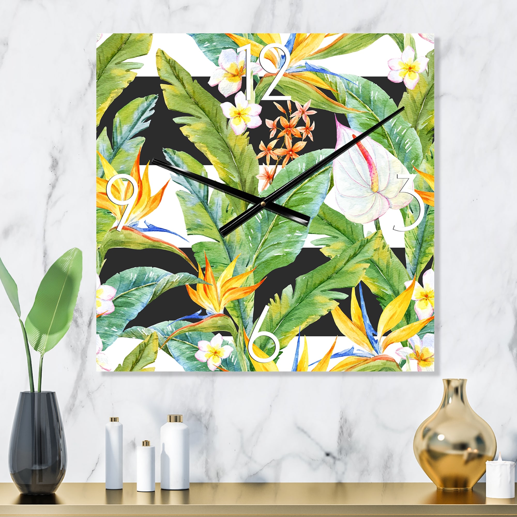 Designart 'Tropical Foliage and Yellow Flowers VI' Modern wall clock