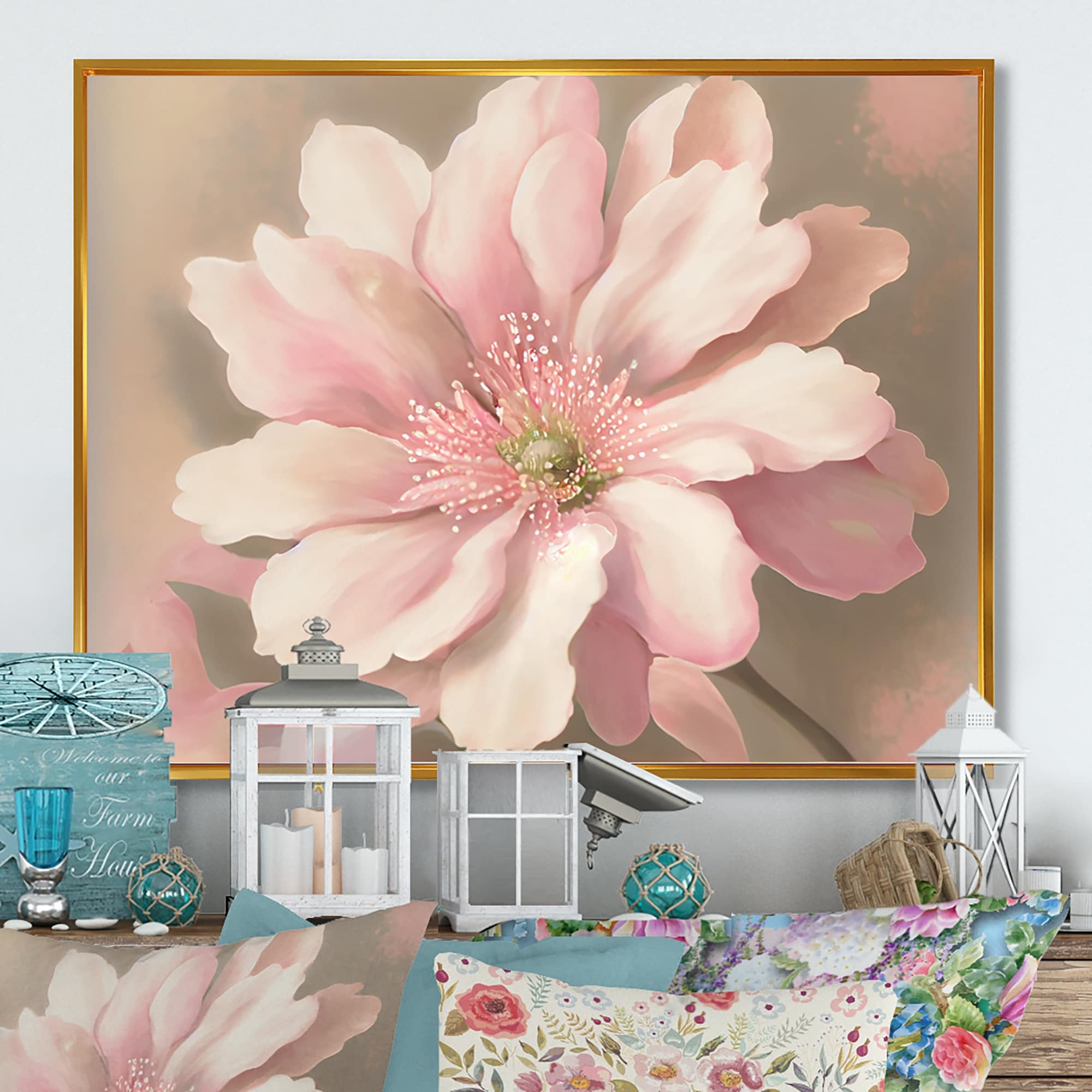 Designart "Blossoming Pink Flower in Faded Retro Colours II" Floral Framed Canvas Wall Art Print
