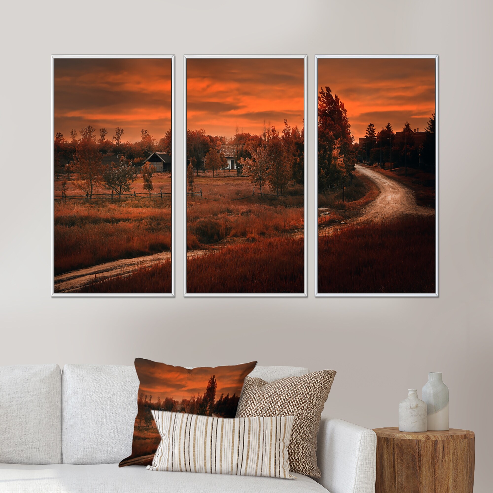 Designart "Dark Pink Sunset Over the Road By the Farm" Farmhouse Framed Art Prints Set of 3 - 4 Colors of Frames