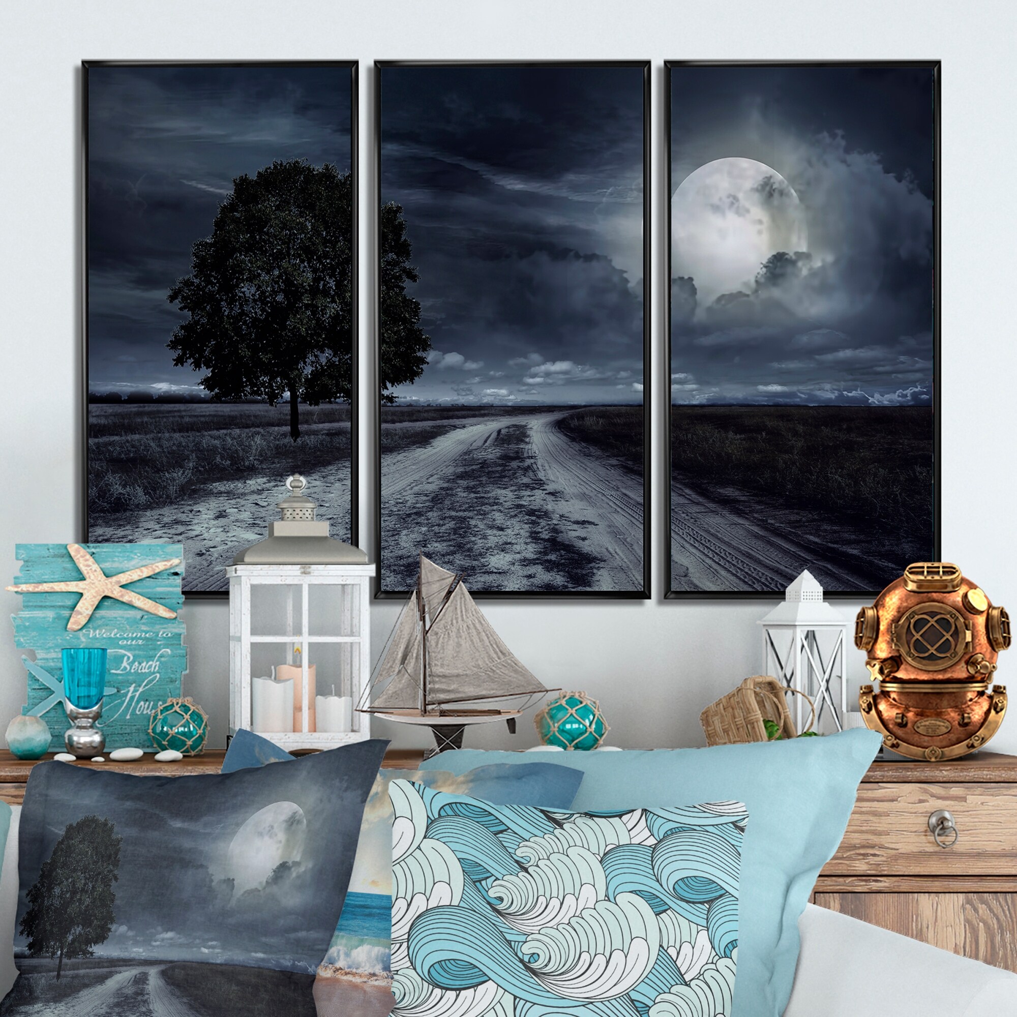 Designart "Paved Road Under A Full Moon" Nautical & Coastal Framed Artwork Set of 3 - 4 Colors of Frames