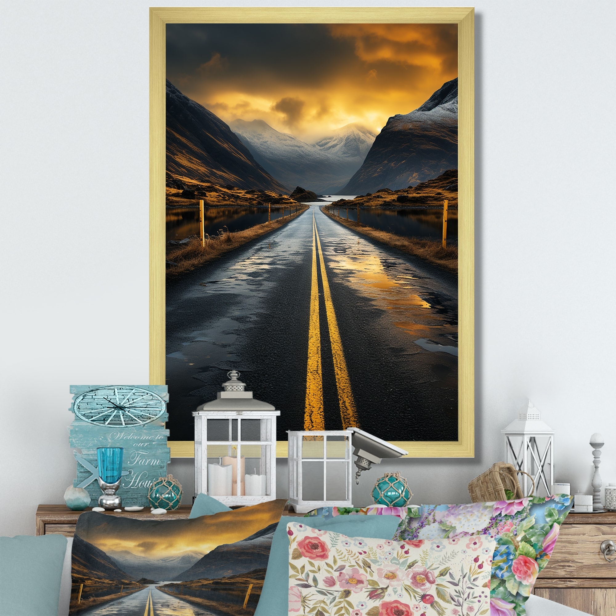 Designart "Road Gold And Grey Sunset III" Road Framed Wall Art Living Room