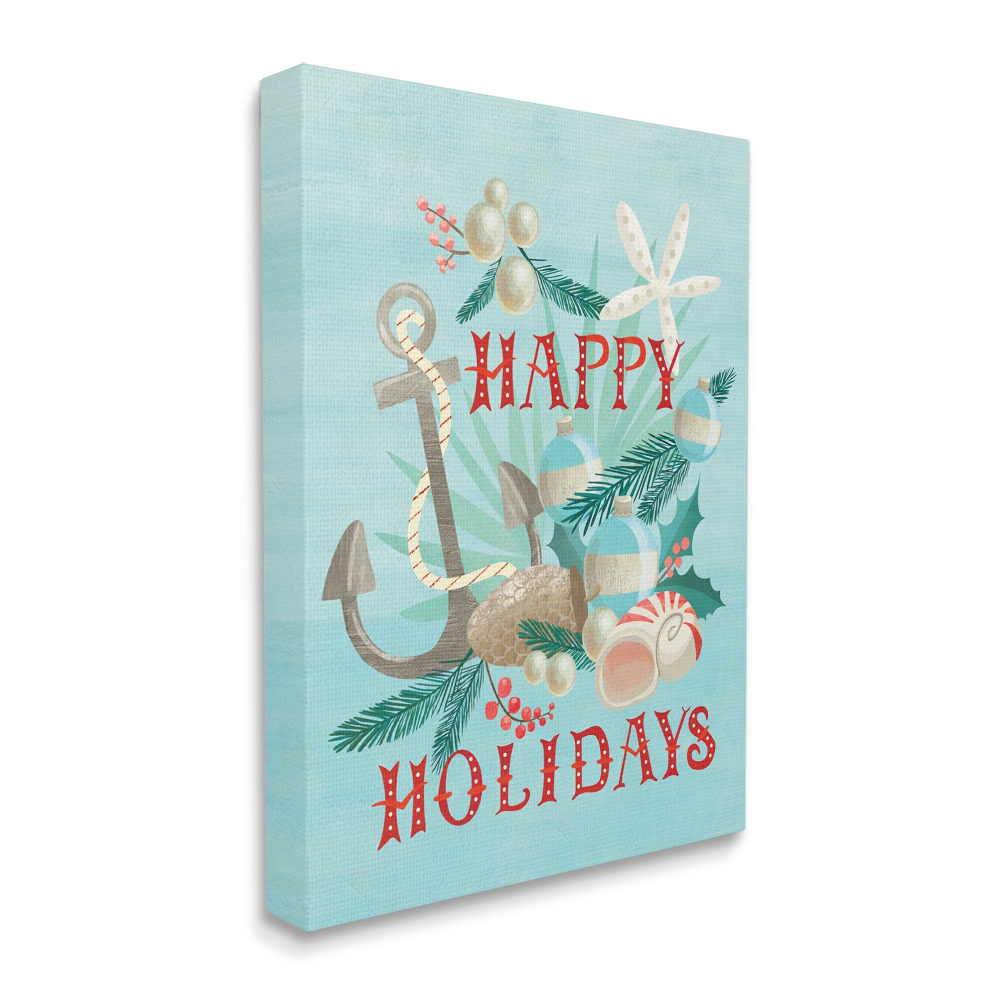 Stupell Industries Happy Holidays Nautical Phrase Beach Anchor Seashells Canvas Wall Art - Blue