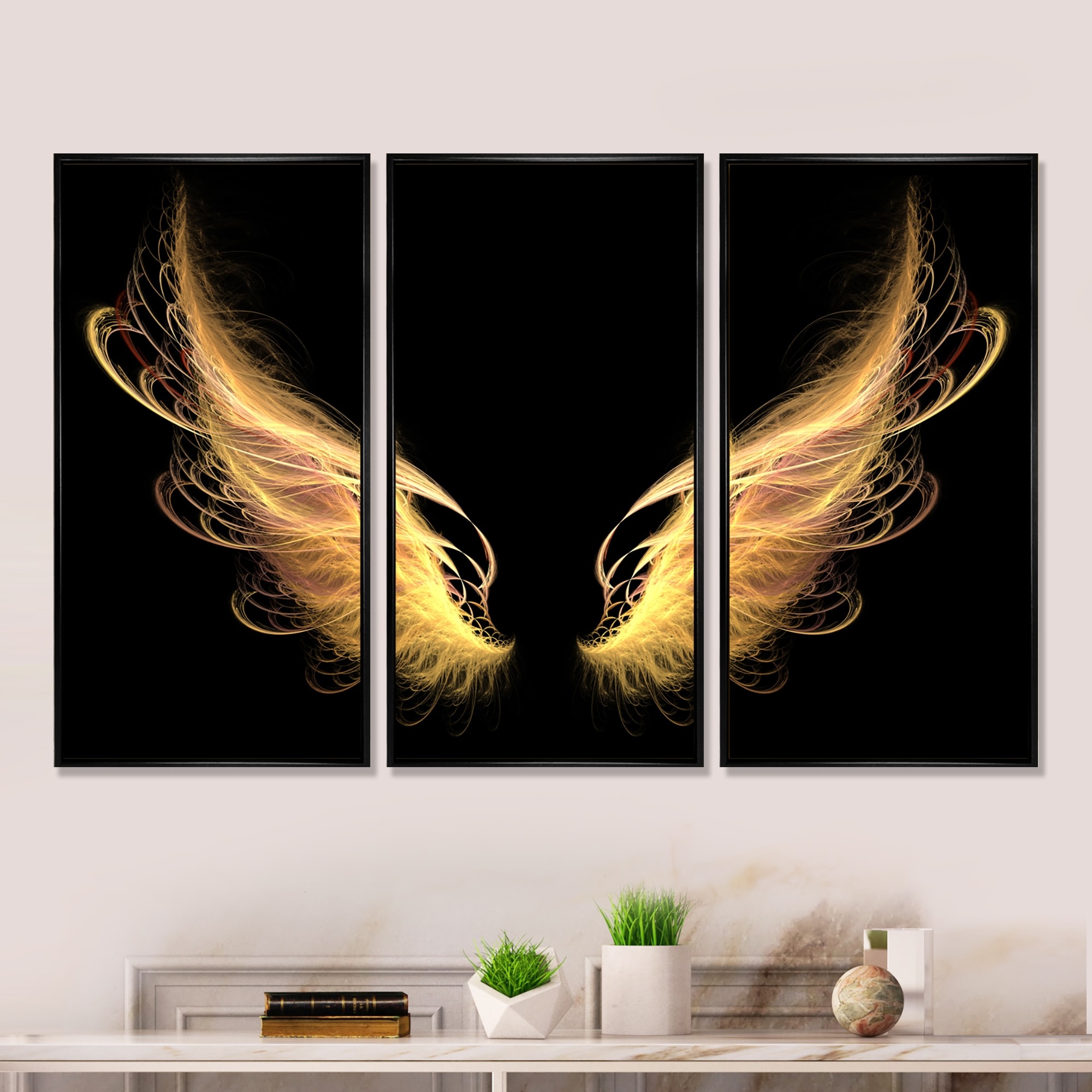 Designart "Golden Angel Wings on Black" Abstract Framed Canvas Wall Art Set of 3 - 4 Colors of Frames