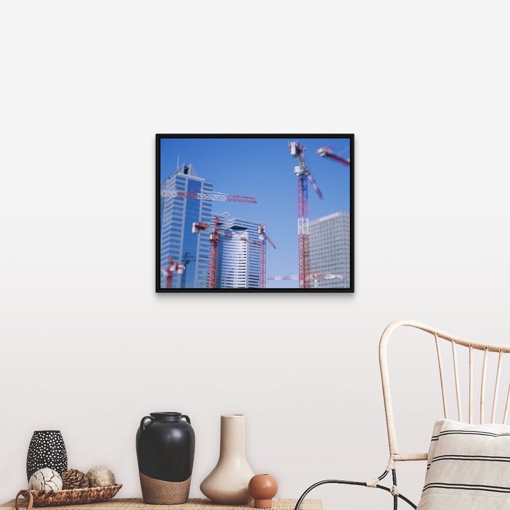 "Low angle view of cranes in front of buildings" Black Float Frame Canvas Art