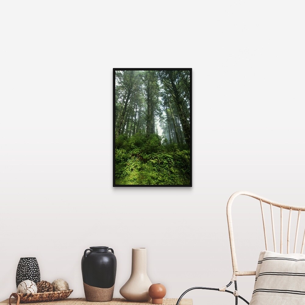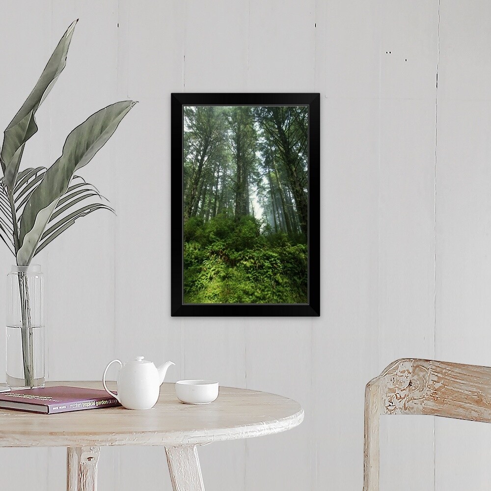 "Low angle view of trees in mist, Cascade Head, Oregon" Black Framed Print